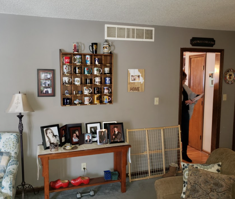 The existing kitchen was dark & dated, separated from the living & dining room. 2 walls were removed to gain space for a large island and dining table. The addition of 2 windows on each side of the tv fill the living room with natural light. The oyster color cabinets are topped with granite countertops. New hardwood flooring was installed throughout the new space as well as down the stairs and down the hallway.