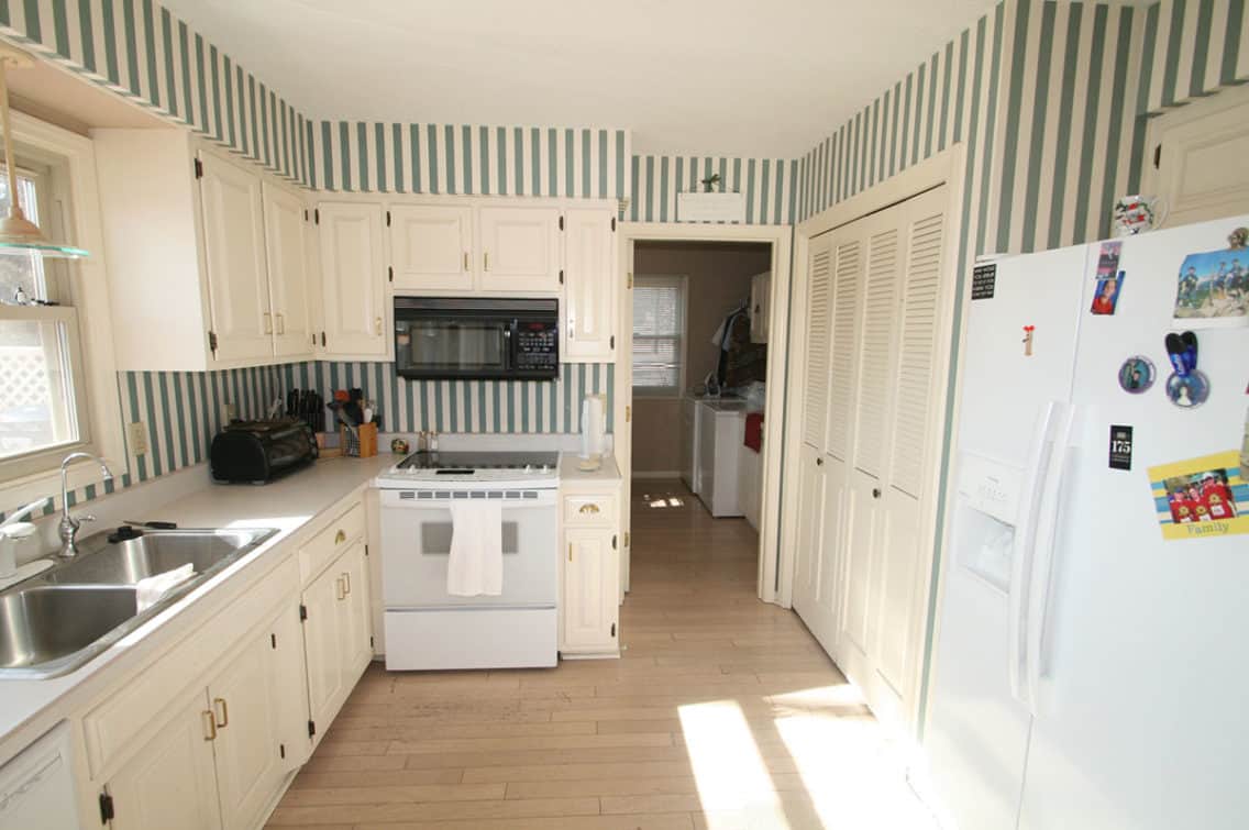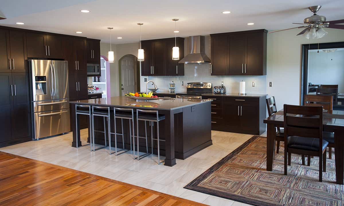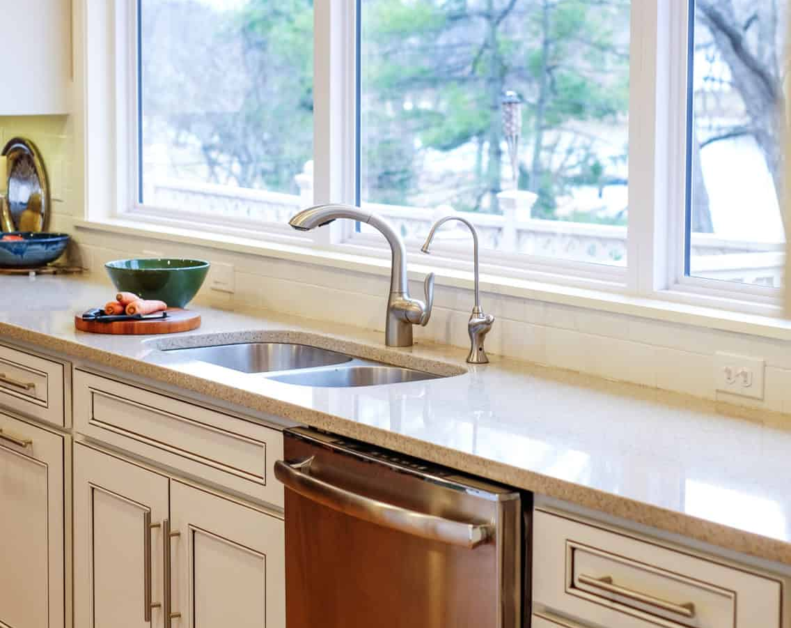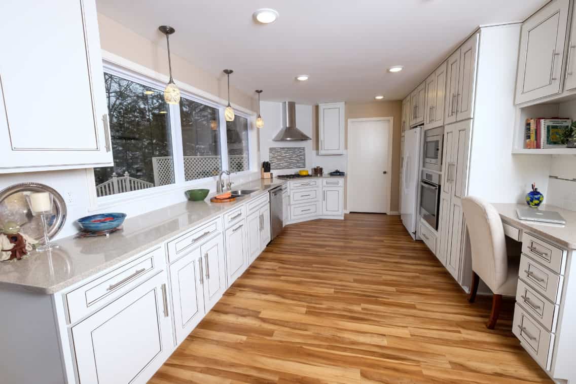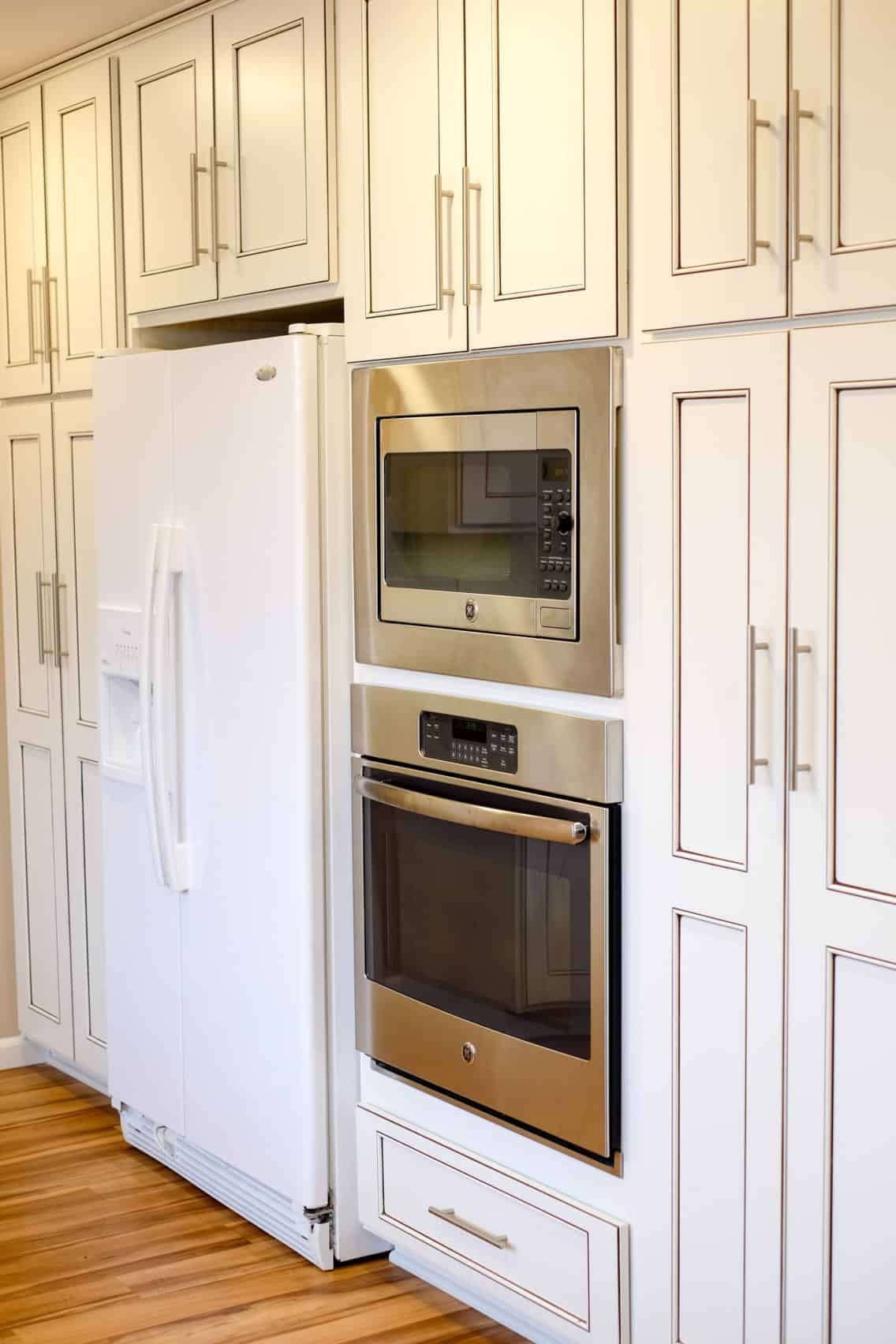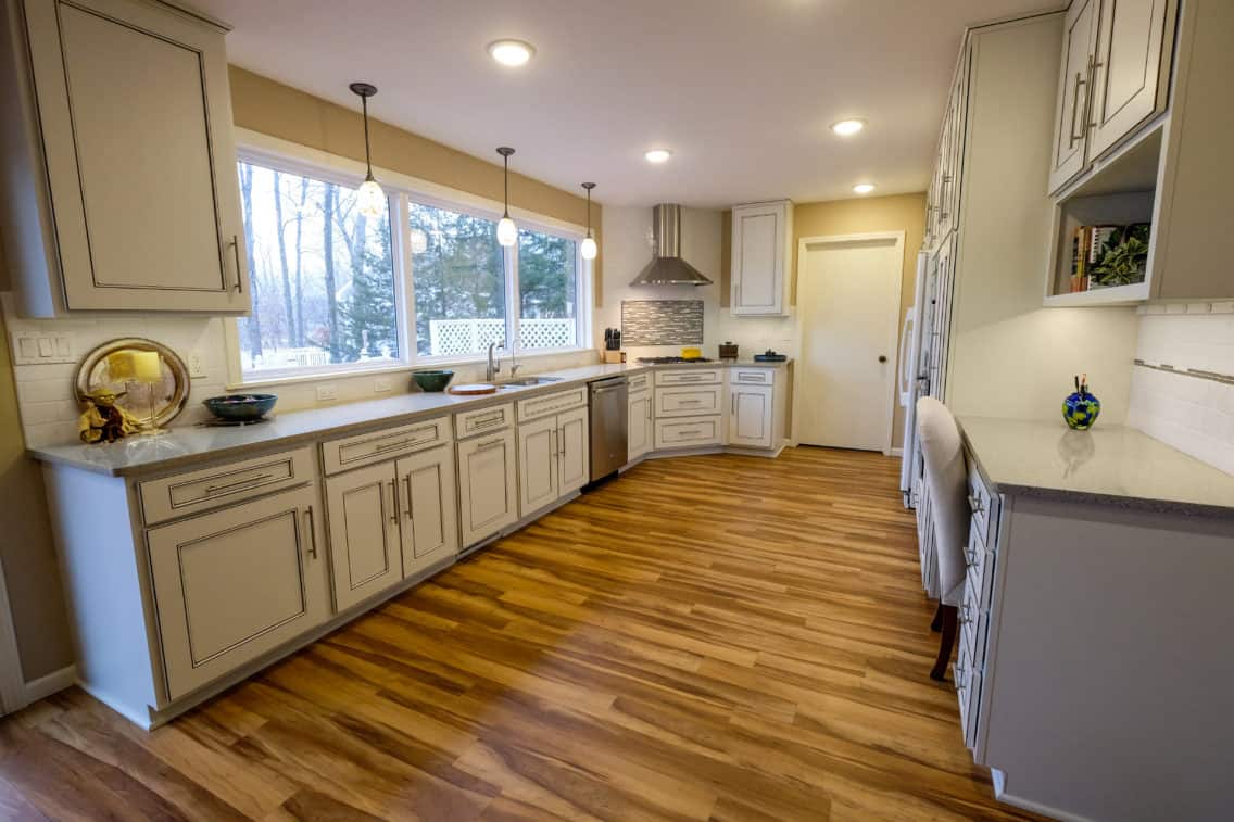 Keith and Jane Boles live on Cedar Lake and raised their family there. The kitchen was in need of updating and they wanted to make the lake a focal point of the kitchen. The goals were: lake view, improved storage, practical use of space, and a home office. The design challenge included a small, awkward corner with a door which could not be moved. The solution included a stove placed in the corner with a gas cooktop and a stainless steel, professional quality vent hood. The solutions also included moving appliances, adding a double wall oven, creating a new pantry with pull-out shelves and reframing and enlarging the windows overlooking the lake to improve the aesthetics and the structure supporting the second floor.