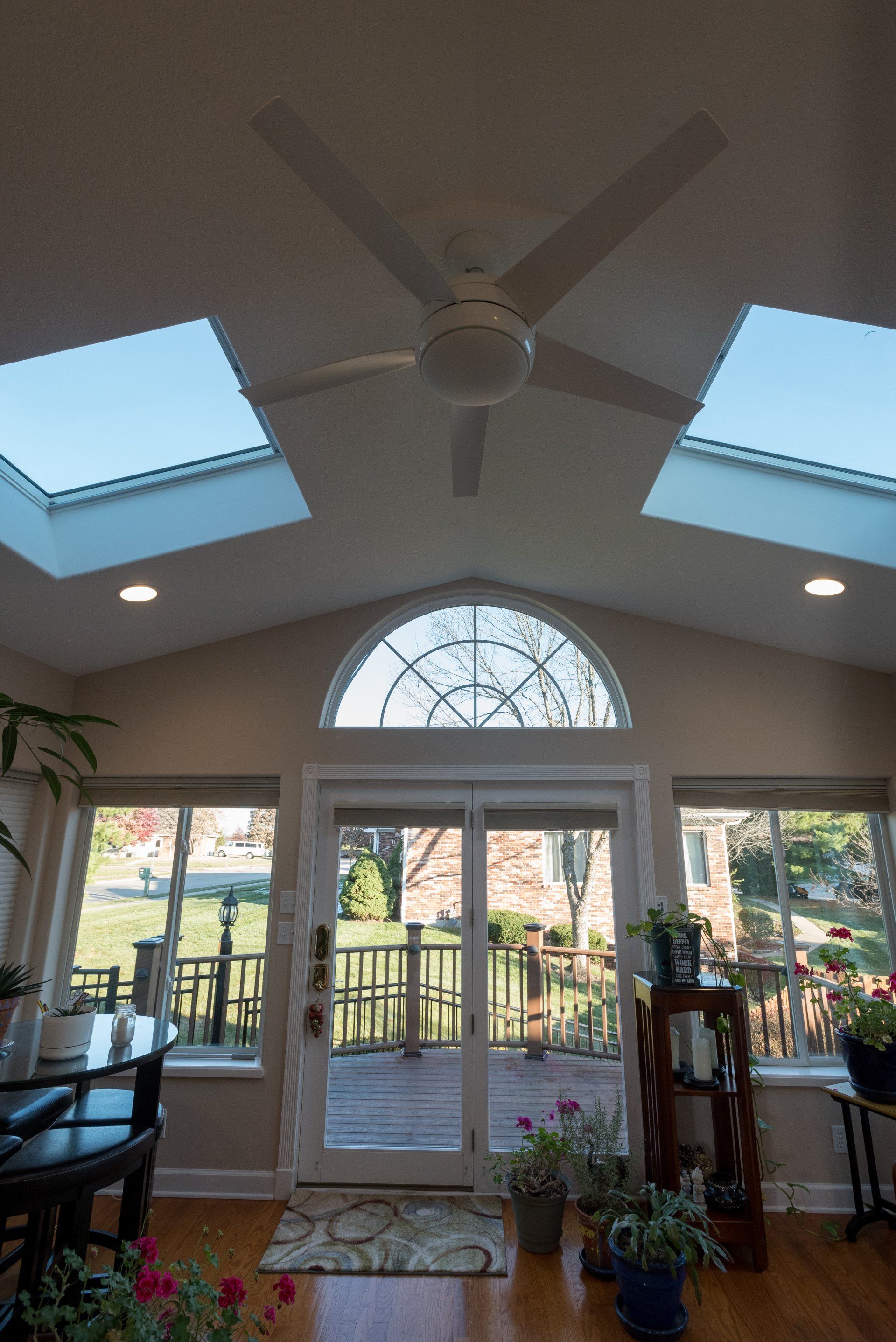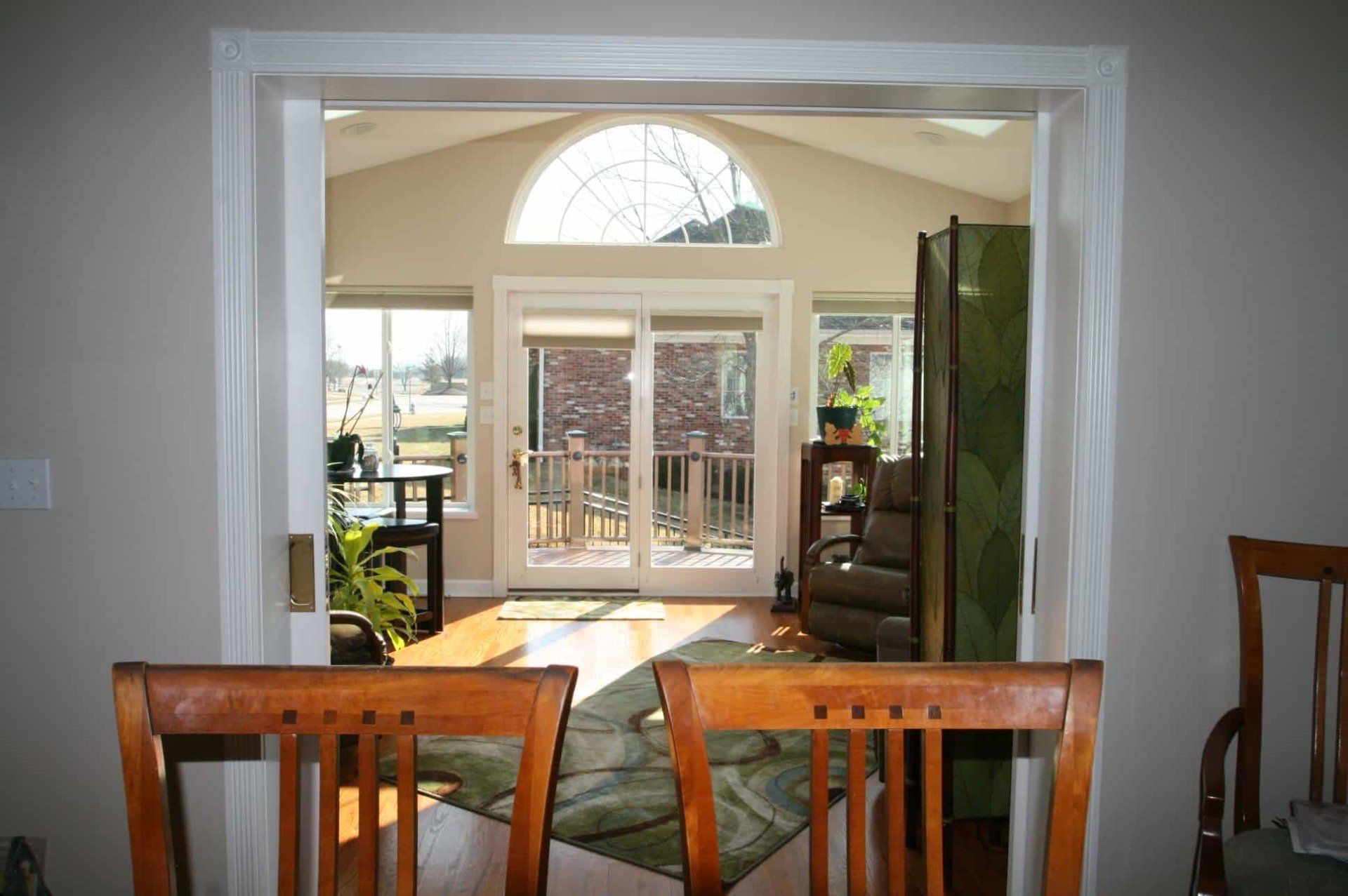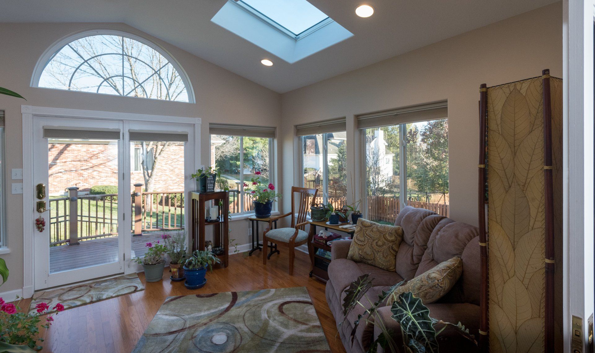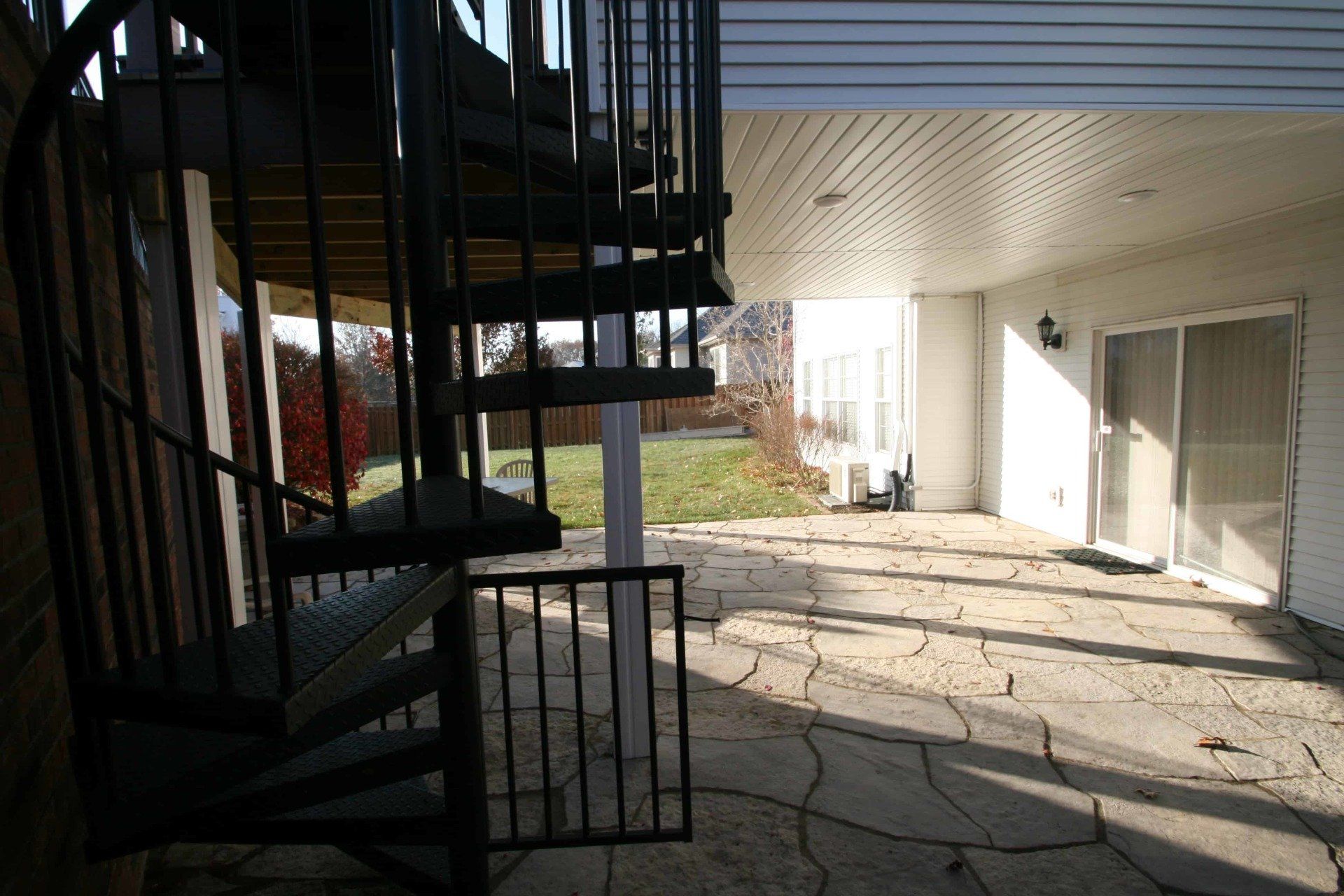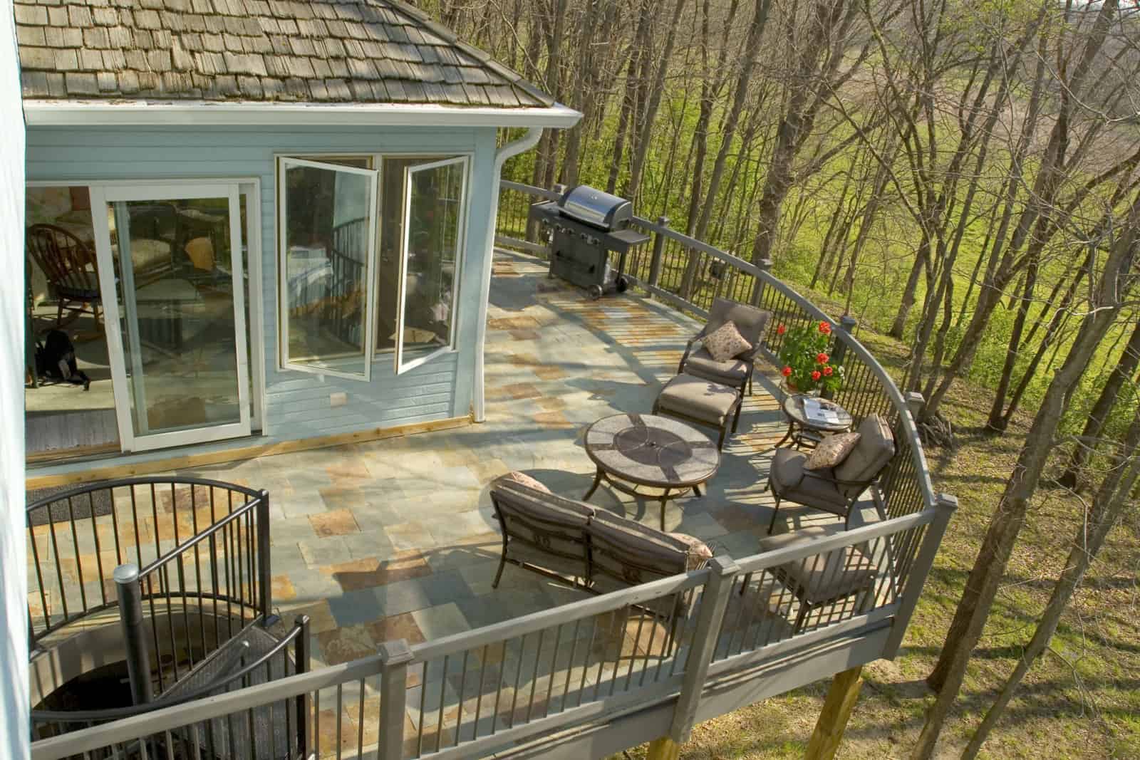 An old, unused deck was converted into a four season sunroom. Glass Panel Pocket doors connect the new room to the existing home, the new no maintenance decking is connected to the lower level with a spiral staircase. The existing concrete pad was covered with new stone pavers.