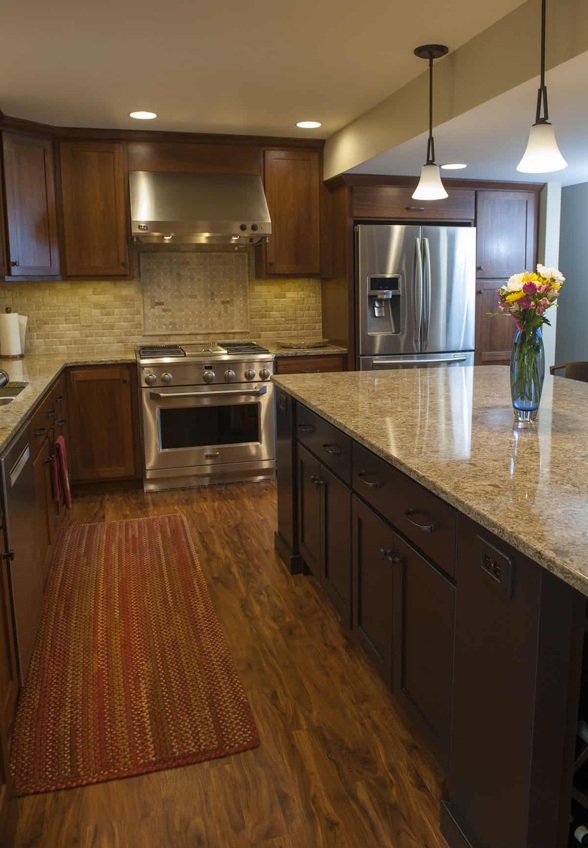 John and Julie Hickey love to entertain their family and friends, but the layout of their house made it challenging. With the expertise of designer Angela Holloway and Kerry Bramon Remodeling and Design, the Hickeys’ home can now accommodate everyone comfortably. KBRD renovated the kitchen, dining and family room, creating a new traffic flow and incorporating space for a very large dining table. The oversized kitchen island is a perfect gathering place for family and friends, and can also provide additional seating for the family’s large get-togethers. The wood-plank vinyl floor is warmer than tile, softer than hardwood, and blends the three rooms together.