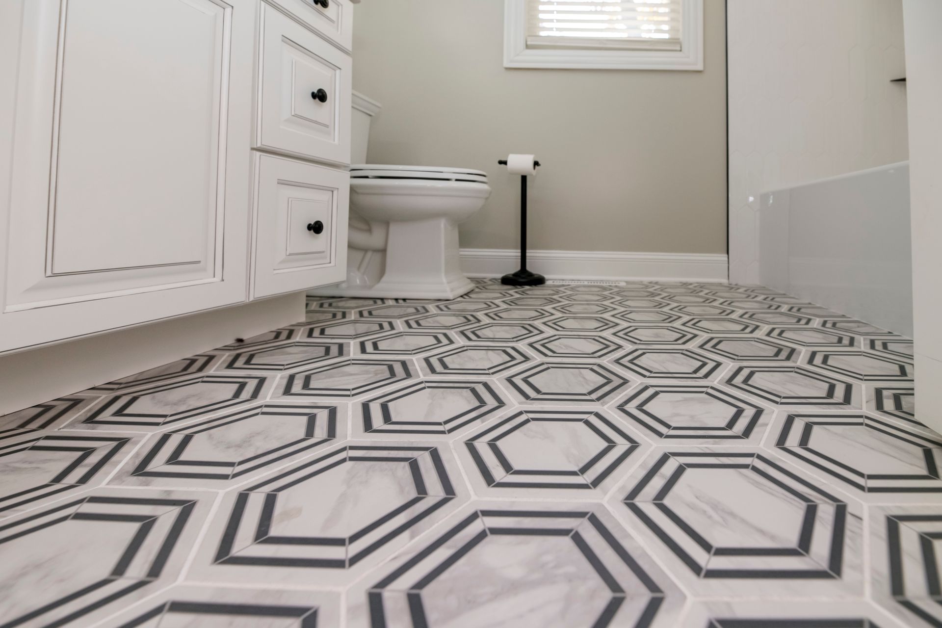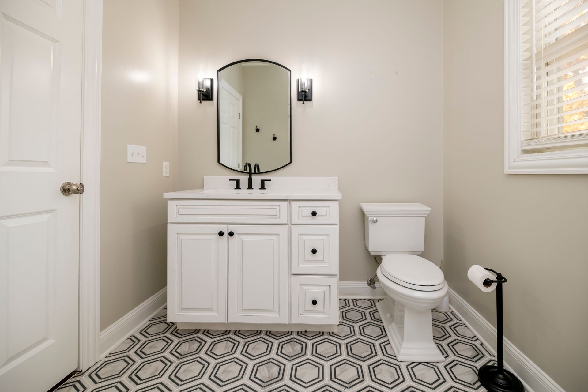 The bathroom also received a modern update, featuring new tile flooring and a tiled shower with updated fixtures. We completed the look with a fresh vanity and toilet, bringing a cohesive and contemporary feel to the space.