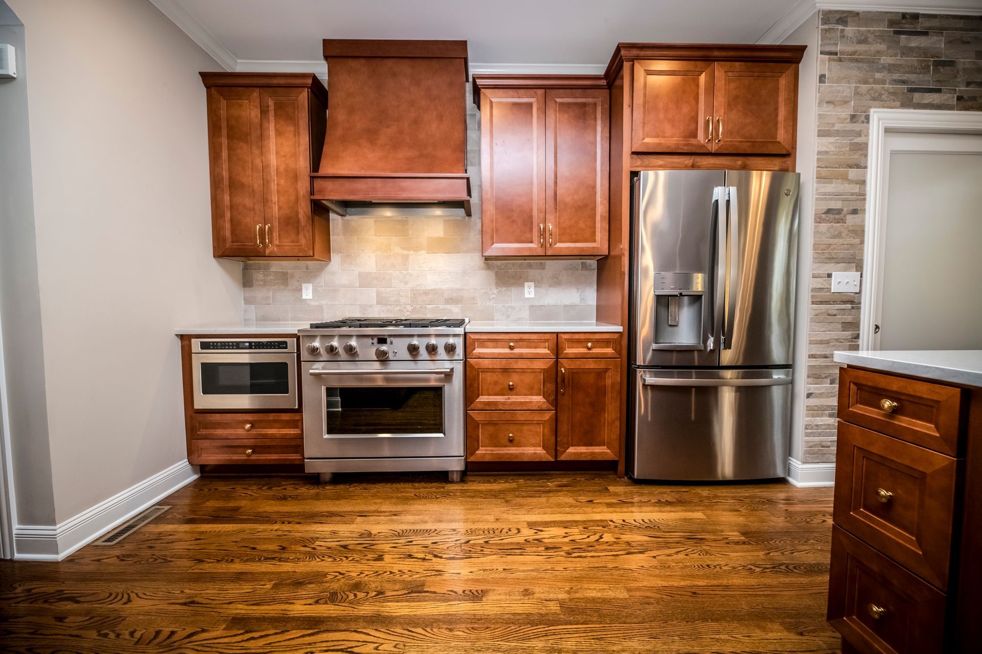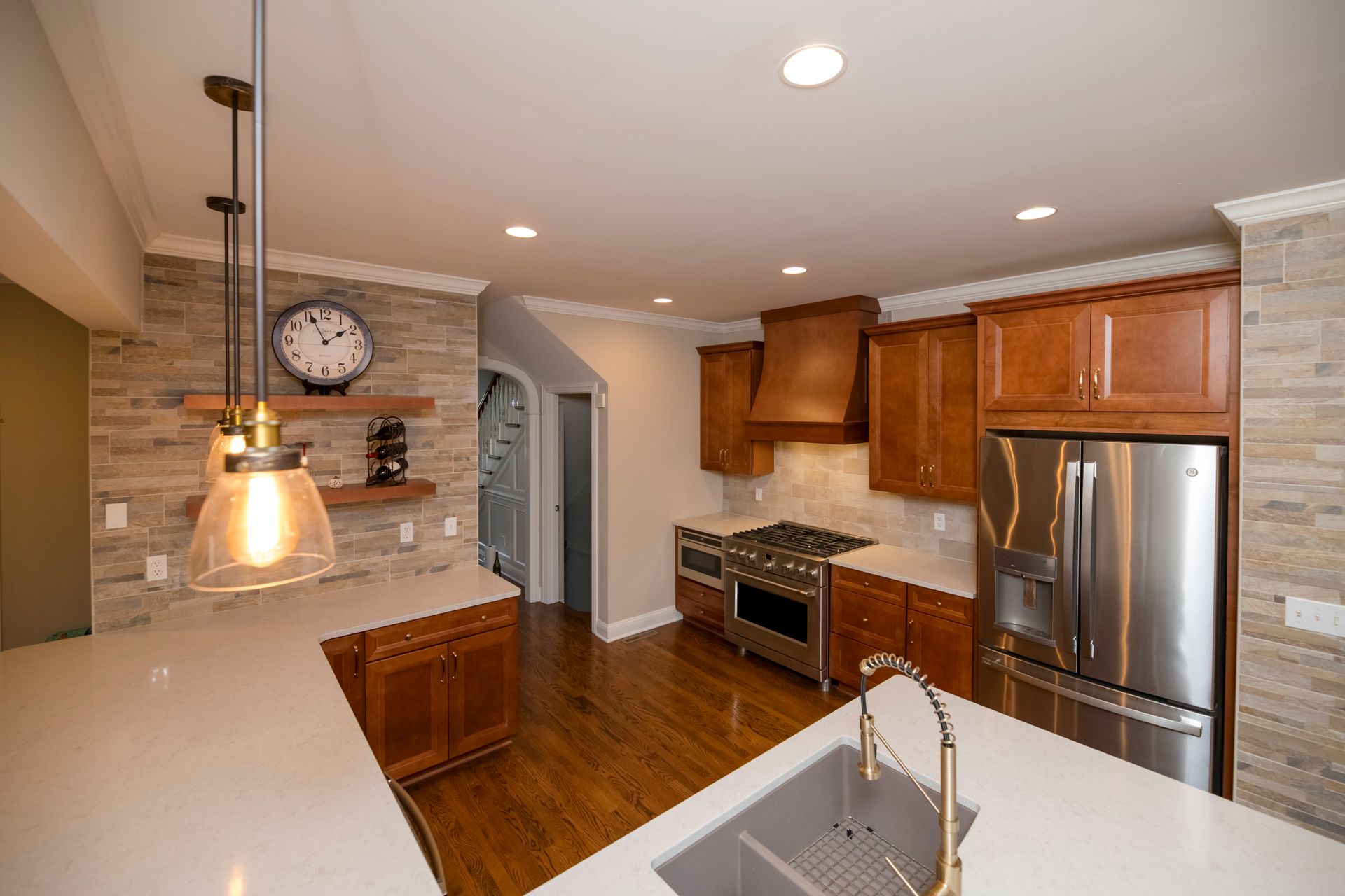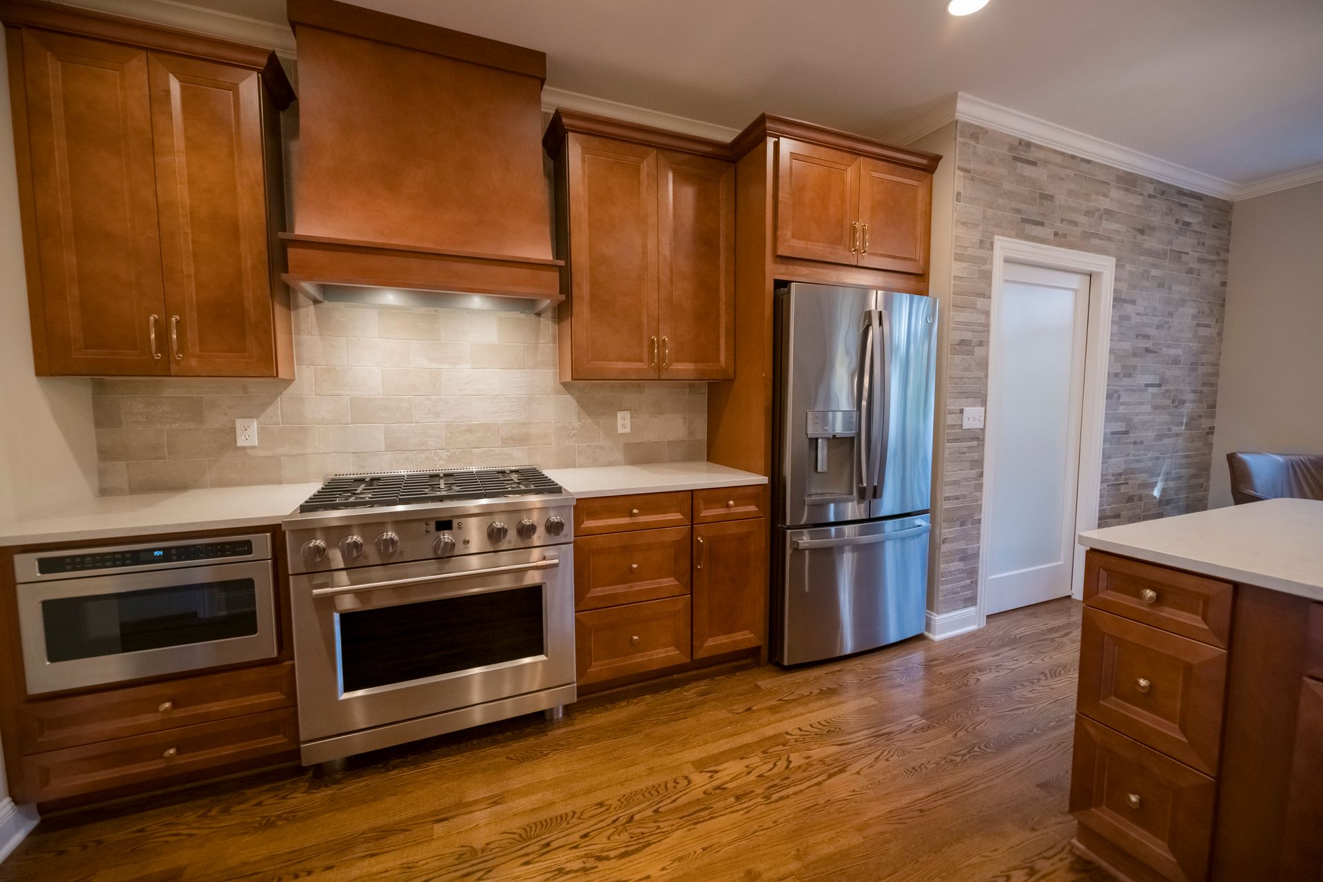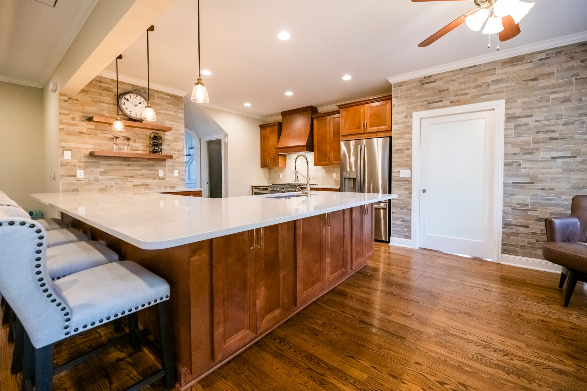 We transformed a closed-off kitchen and living space into an open, inviting area that enhances flow and functionality. We installed new cabinets, complemented by elegant quartz countertops and modern appliances, and added stylish backsplashes and upgraded lighting to complete the kitchen transformation. To maximize storage, we created a pantry with a unique bomber door, compensating for the reduction in cabinet space.
