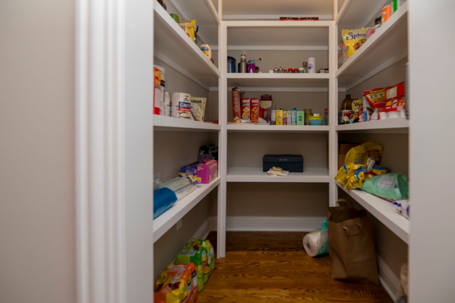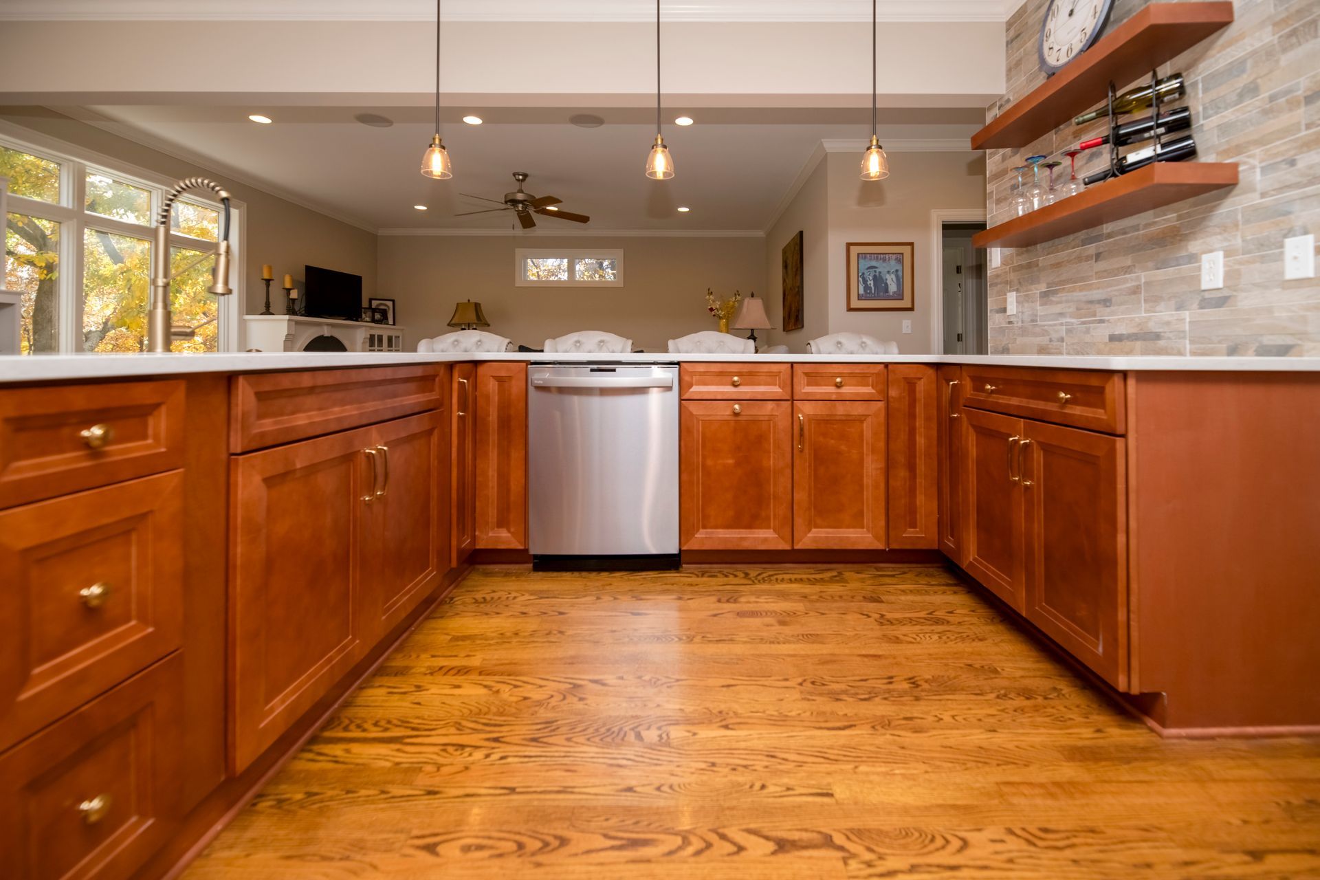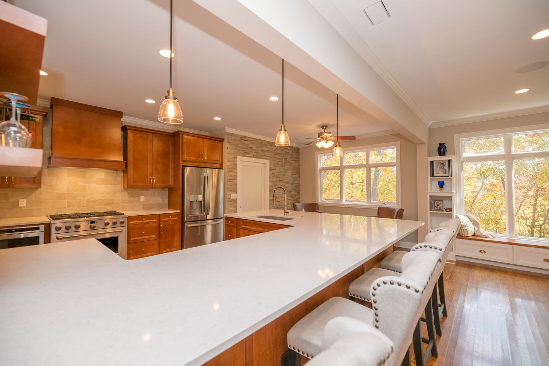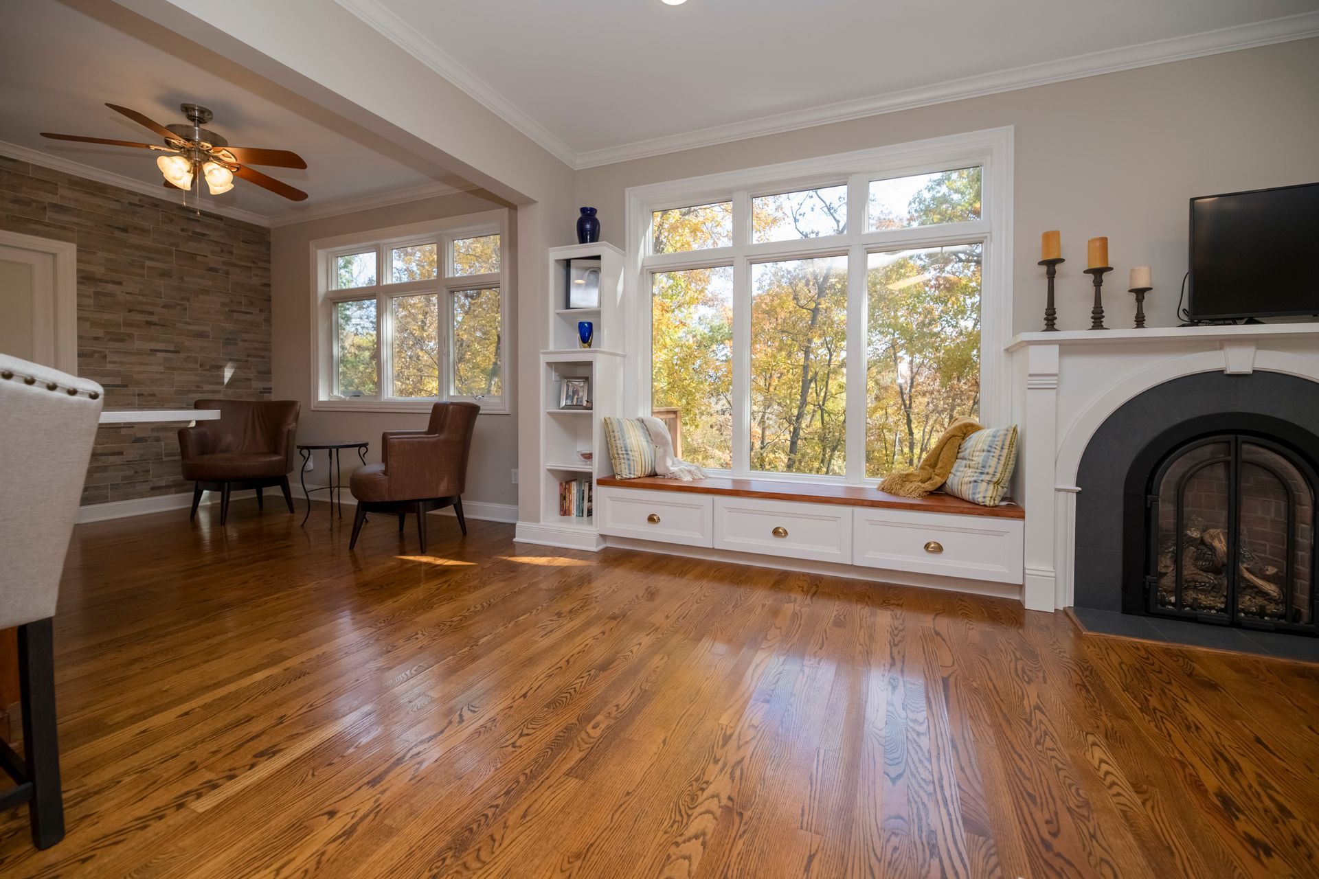 We transformed a closed-off kitchen and living space into an open, inviting area that enhances flow and functionality. We installed new cabinets, complemented by elegant quartz countertops and modern appliances, and added stylish backsplashes and upgraded lighting to complete the kitchen transformation. To maximize storage, we created a pantry with a unique bomber door, compensating for the reduction in cabinet space.