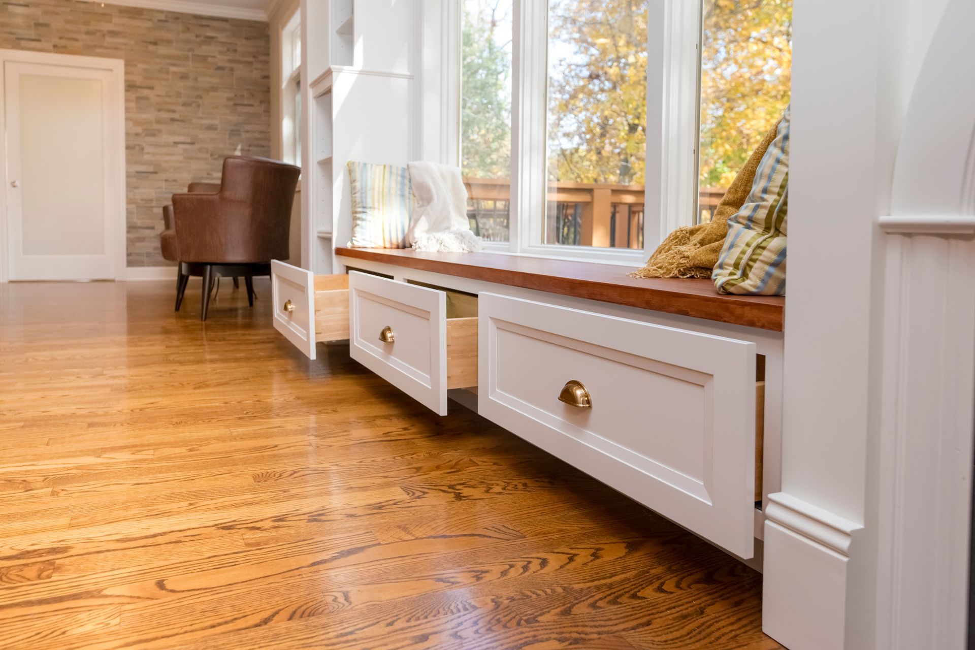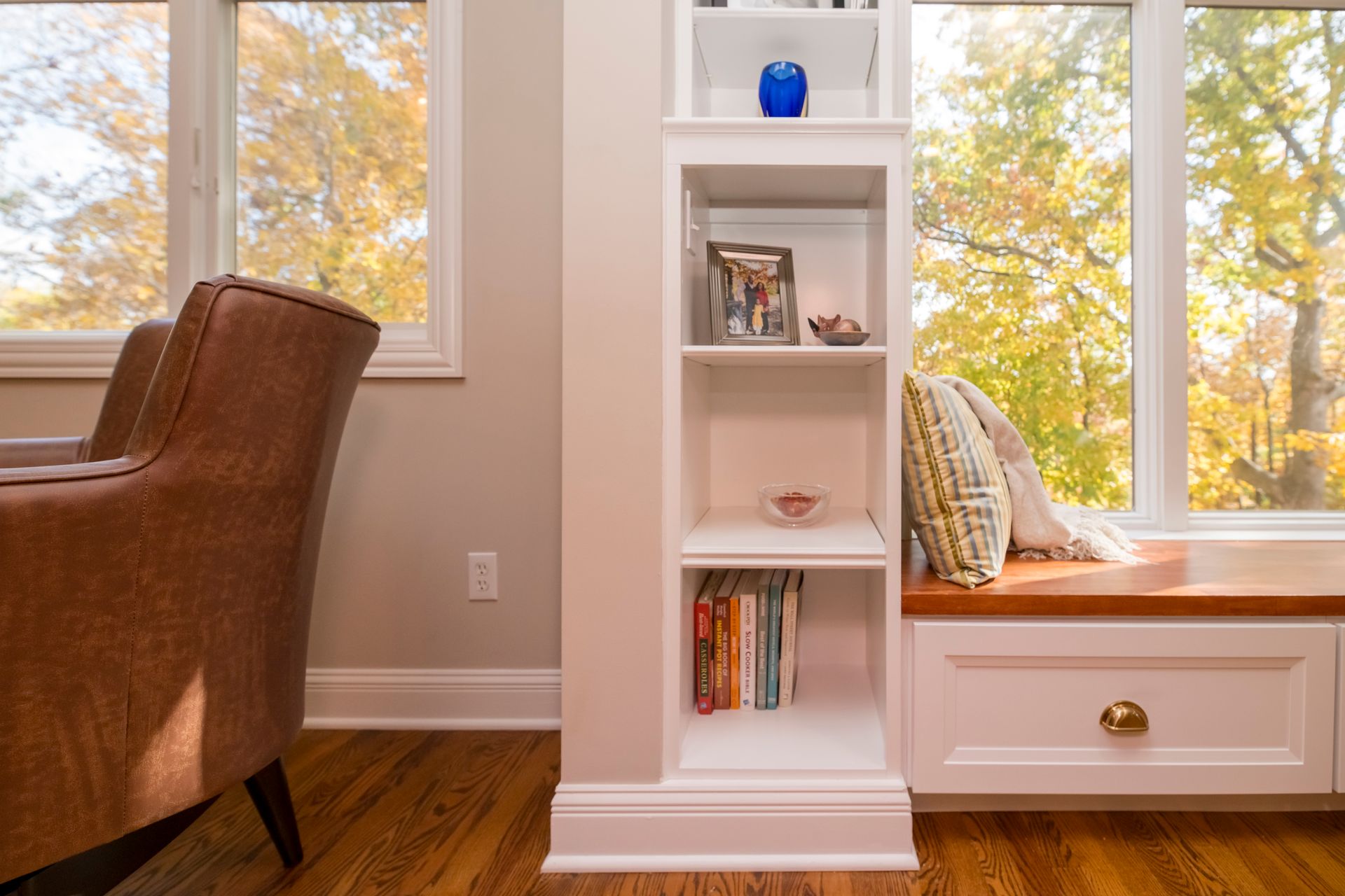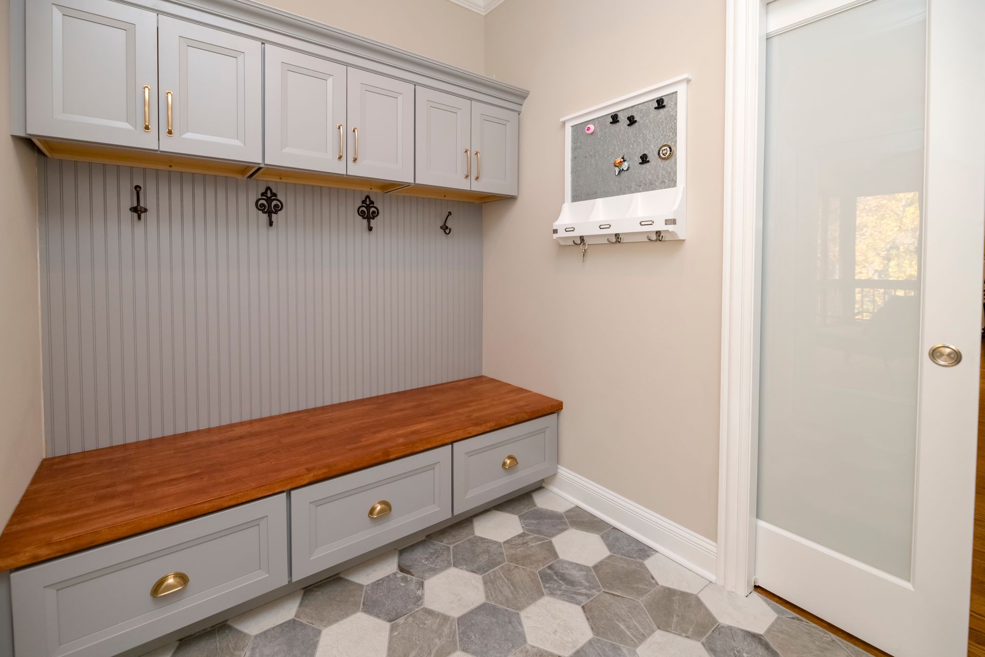 Additionally, we added a convenient mudroom with durable tile flooring, cabinetry, a built-in bench, and French doors, making it the perfect space for seamless transitions in and out of the home.