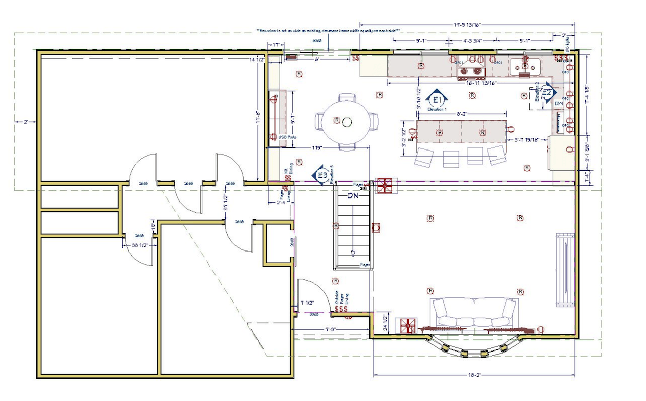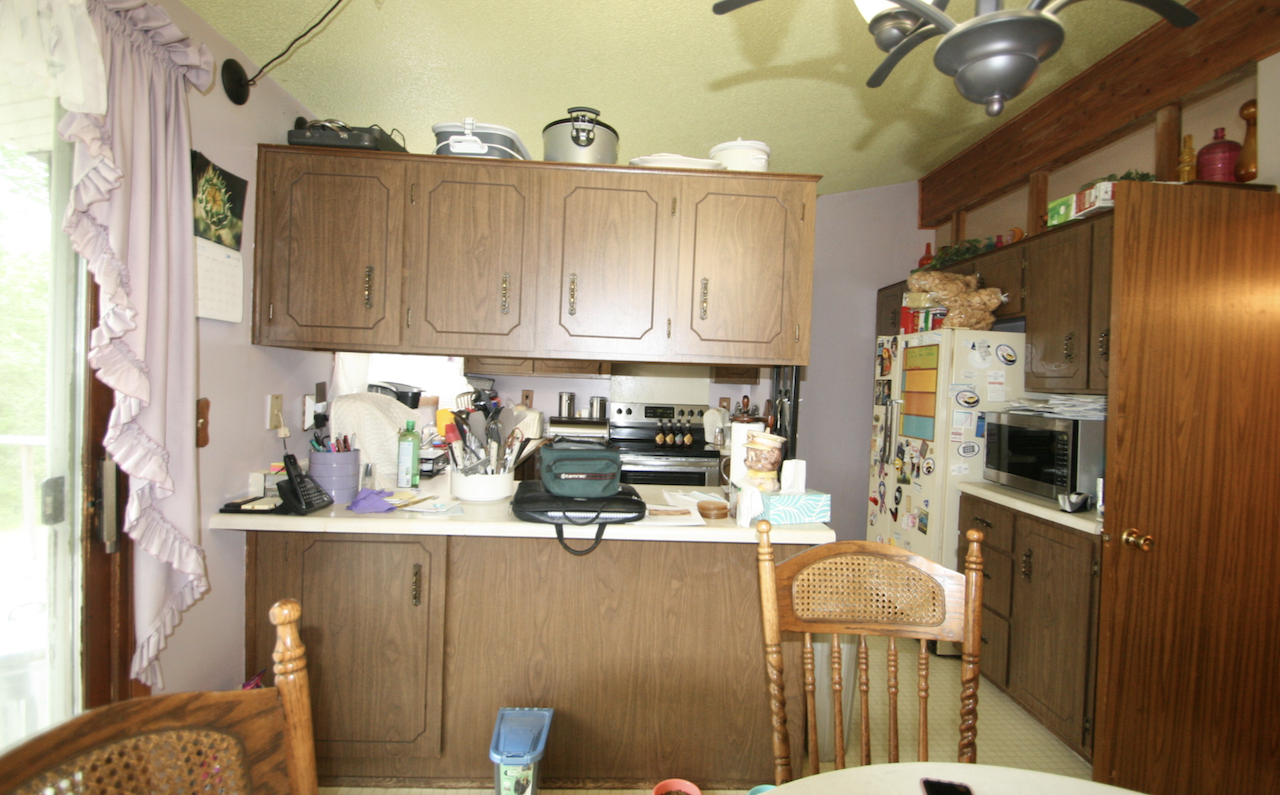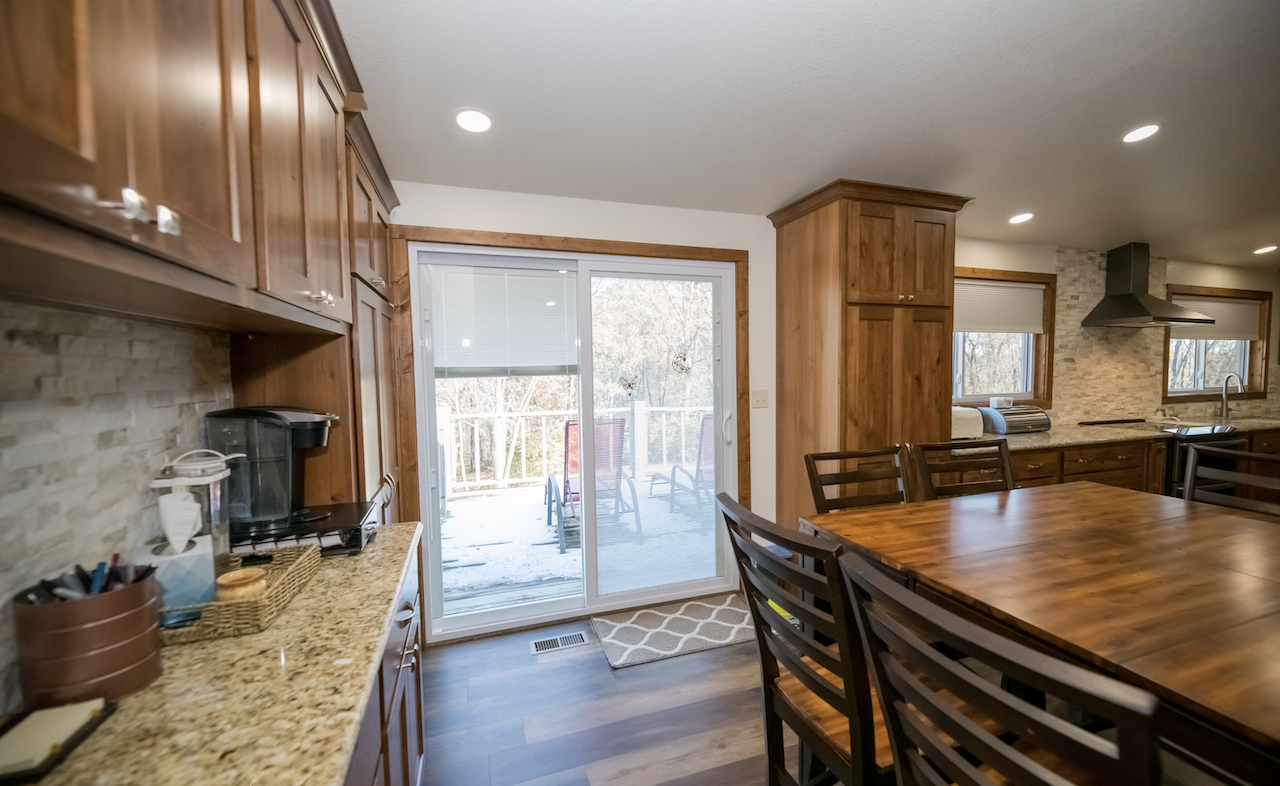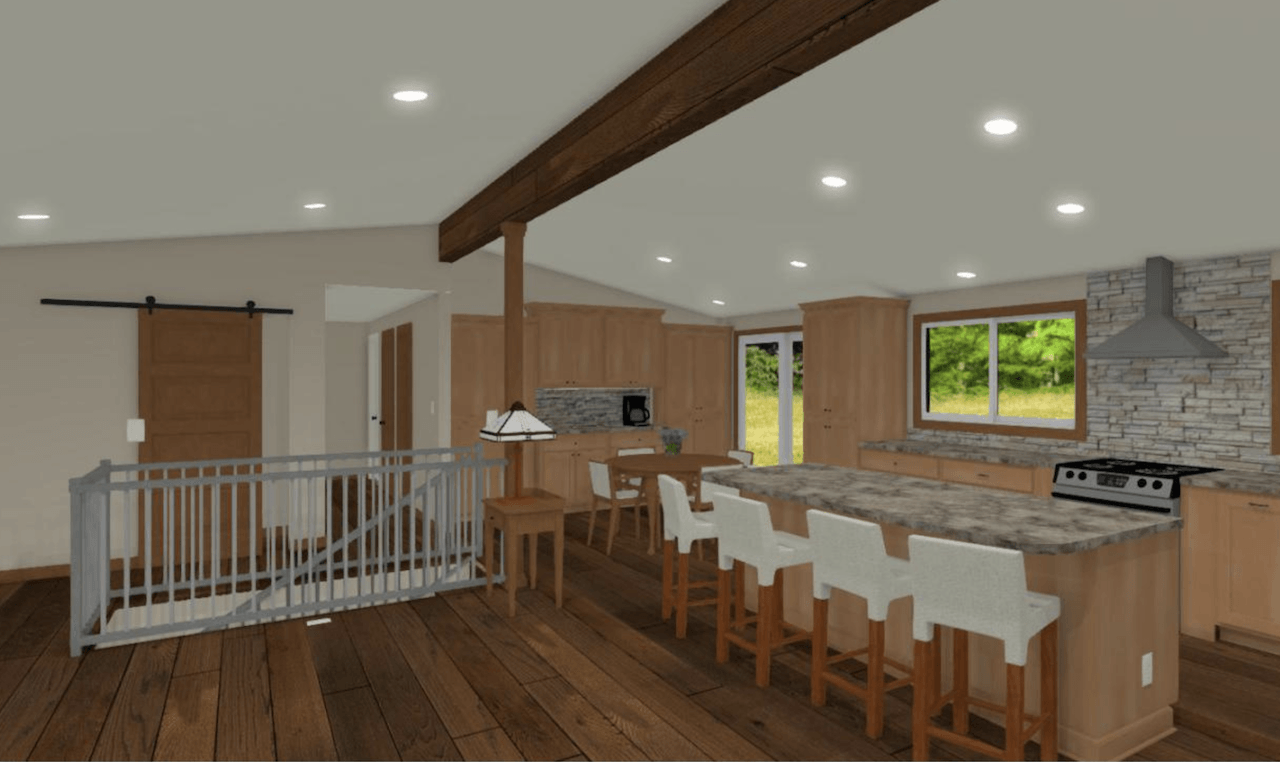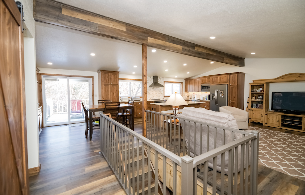 The existing kitchen space was dark and isolated. Chris and Rick Laughlin were ready to take down the dividing walls to create an open floorplan with a large kitchen and eat-in dining space. The walls that surrounded the stairway were also removed and aluminum railing added.