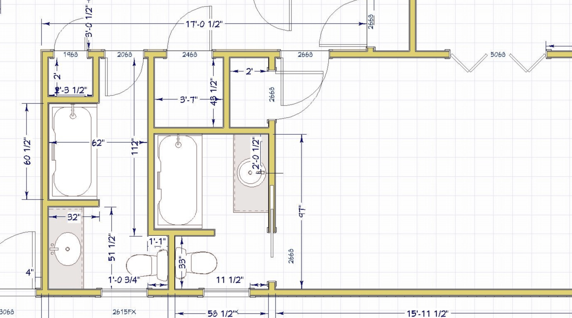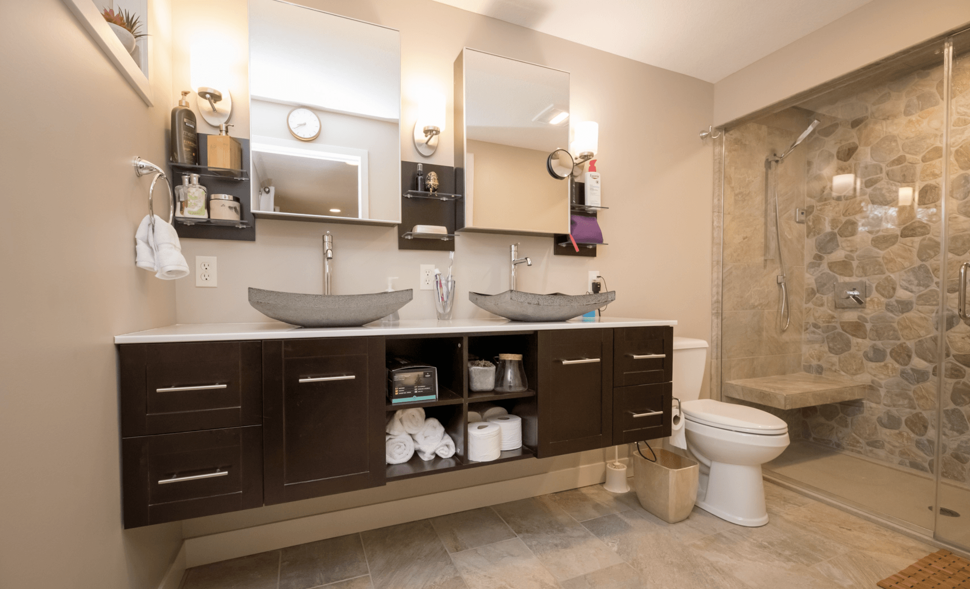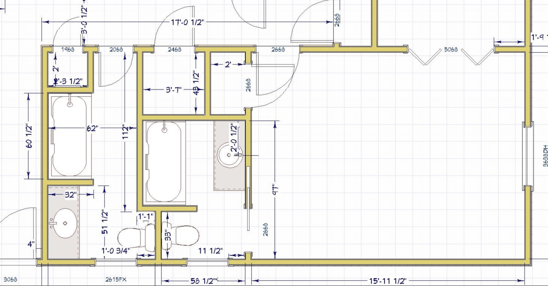 The arrangement of the space changed by removing 2 small closets and an offset. A large steam shower and spacious double sinks with medicine cabinets now occupy this master bath.