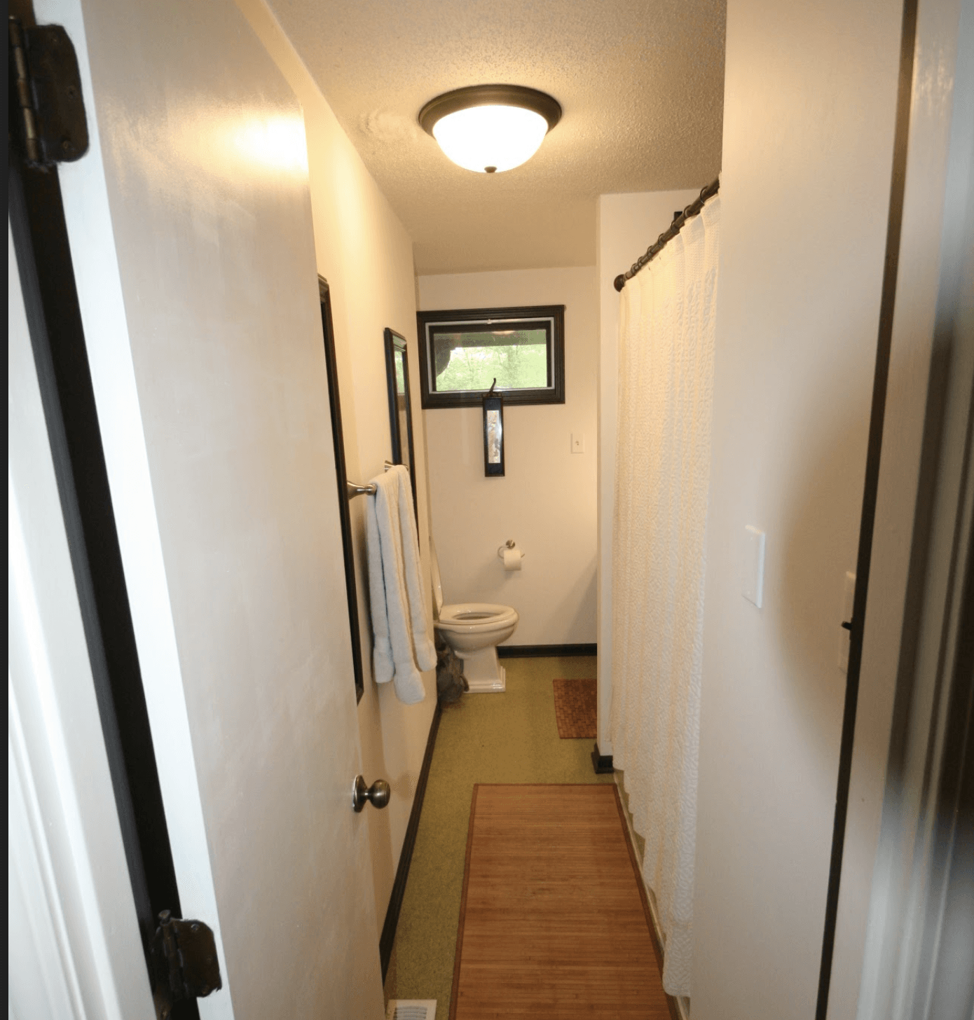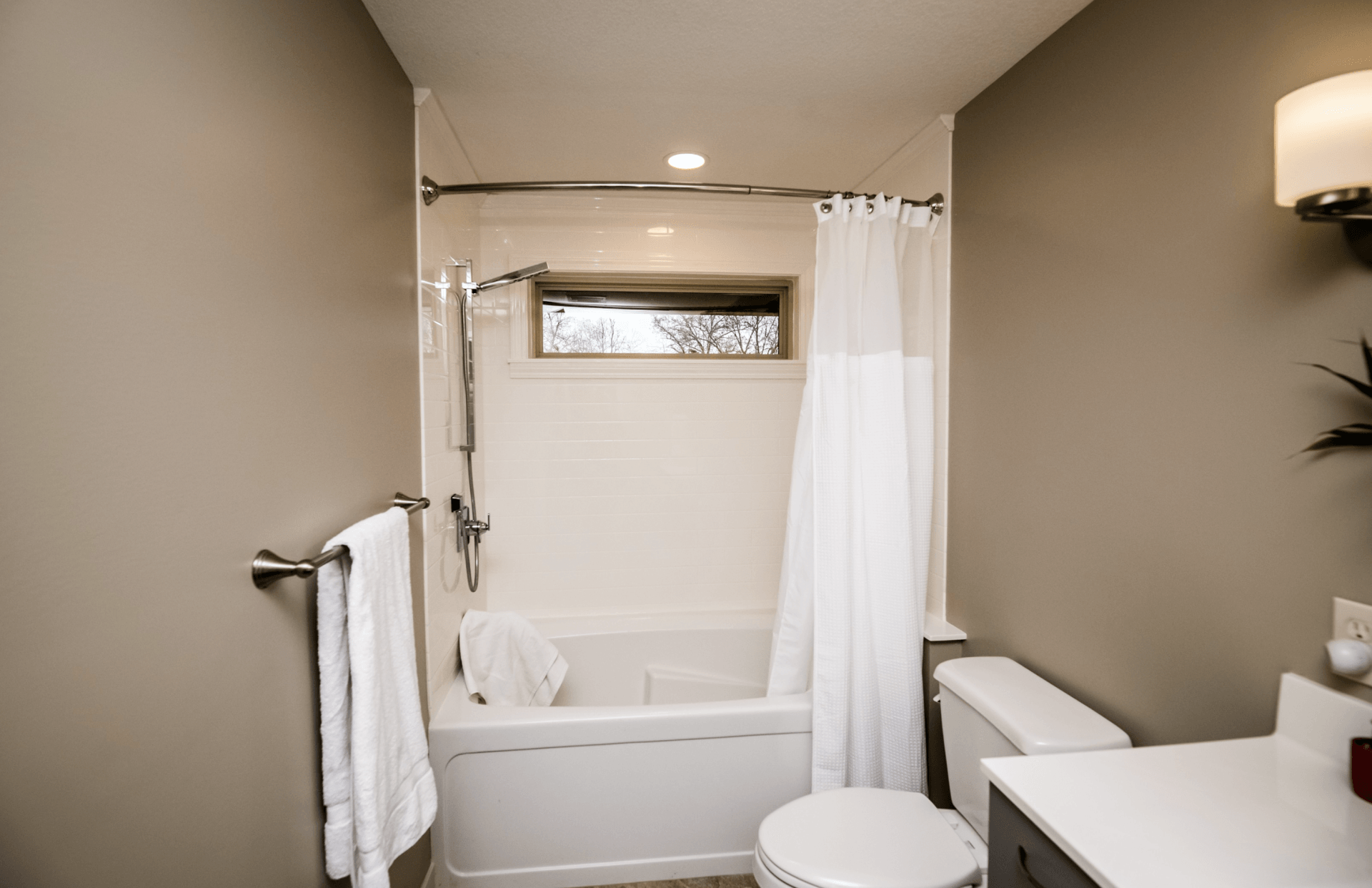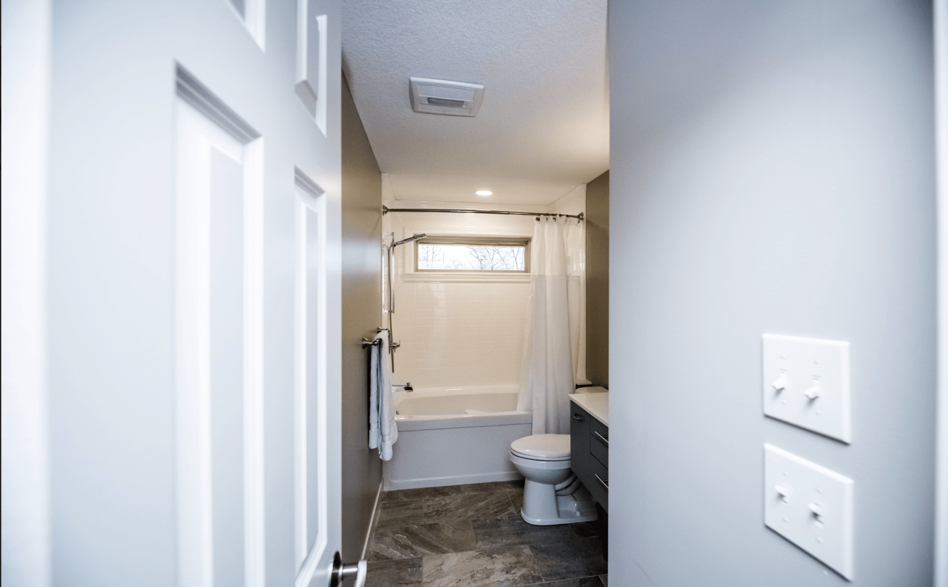 Rearranging this hall bath with the window incorporated into tub/shower and installing a wall hung vanity, allows natural light and a more spacious layout.
