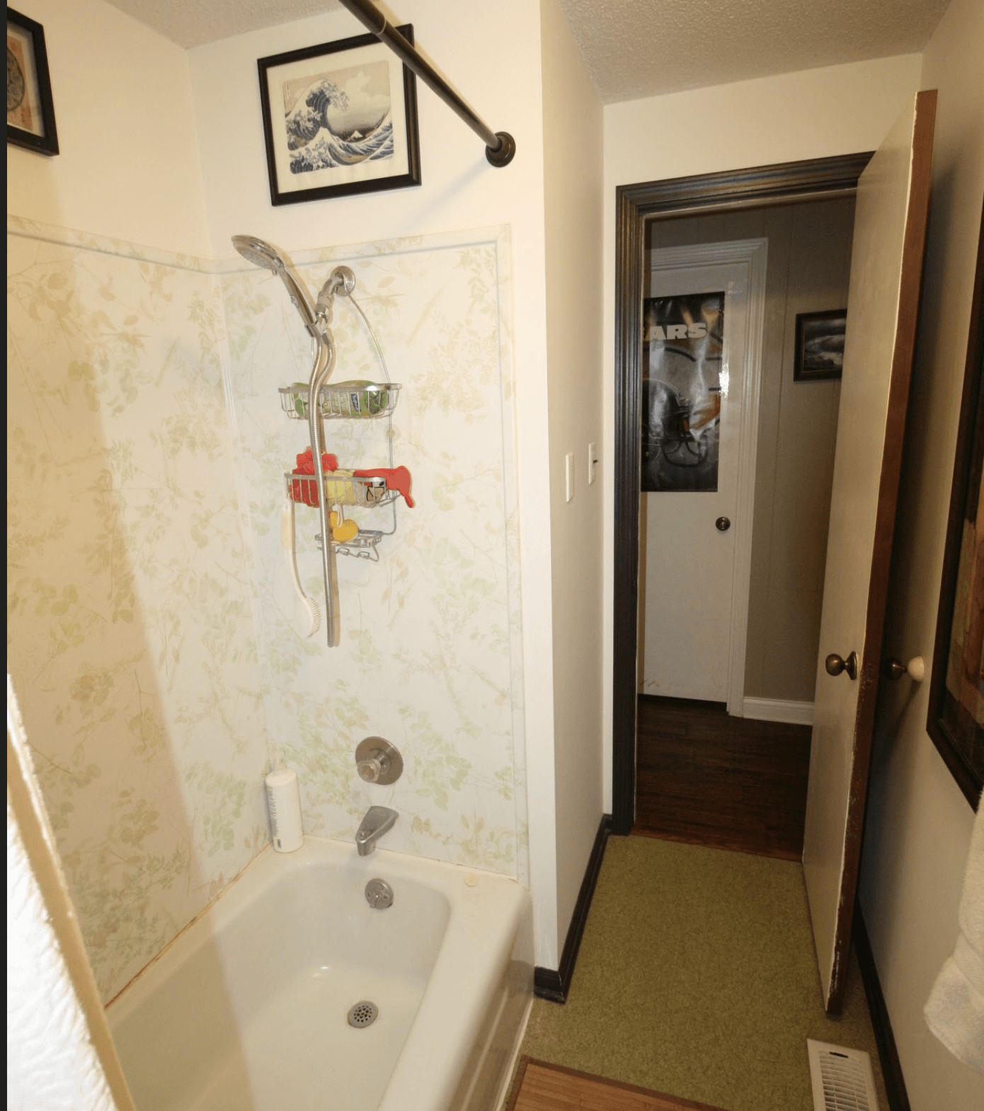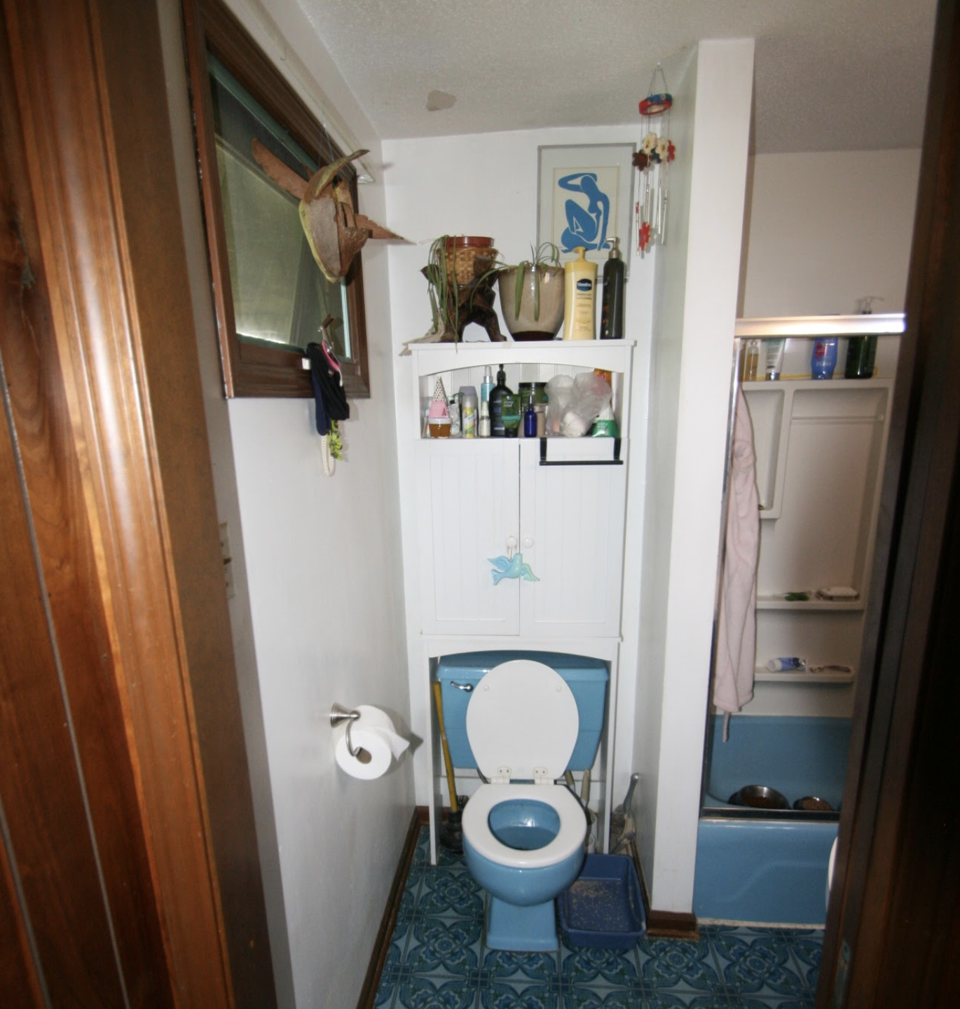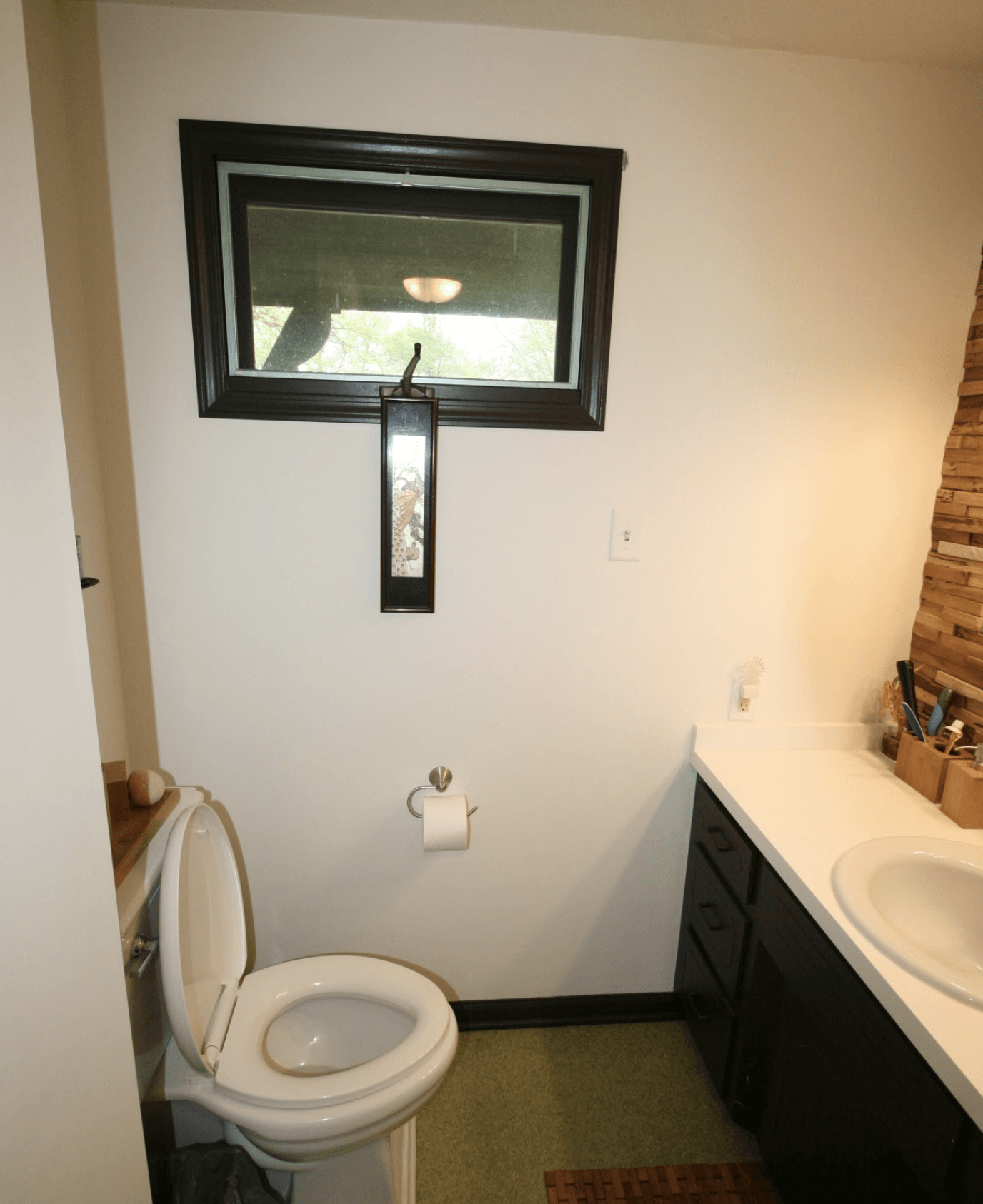 Rearranging this hall bath with the window incorporated into tub/shower and installing a wall hung vanity, allows natural light and a more spacious layout.