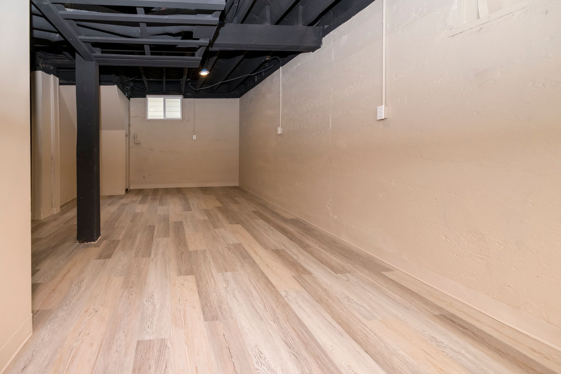 For the basement, we started with a complete demo down to the foundation walls and floor joists. Utility lines in the ceiling were reorganized for a cleaner look, then painted black to create a polished, industrial-style finish. The foundation walls were cleaned and painted for added durability and aesthetics. We installed new, energy-efficient windows and leveled the floor, completing the transformation with durable, waterproof luxury vinyl plank (LVP) flooring for a sleek, resilient surface.