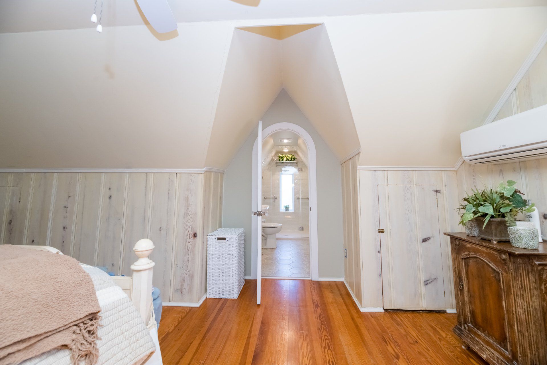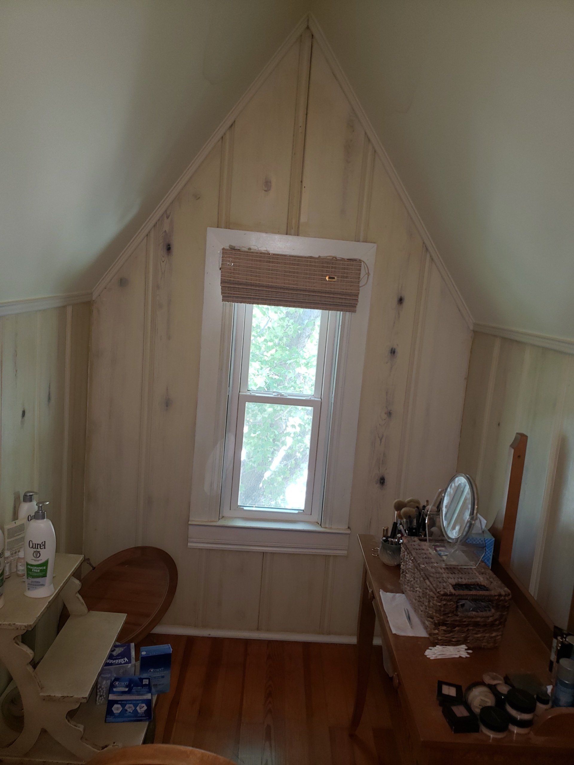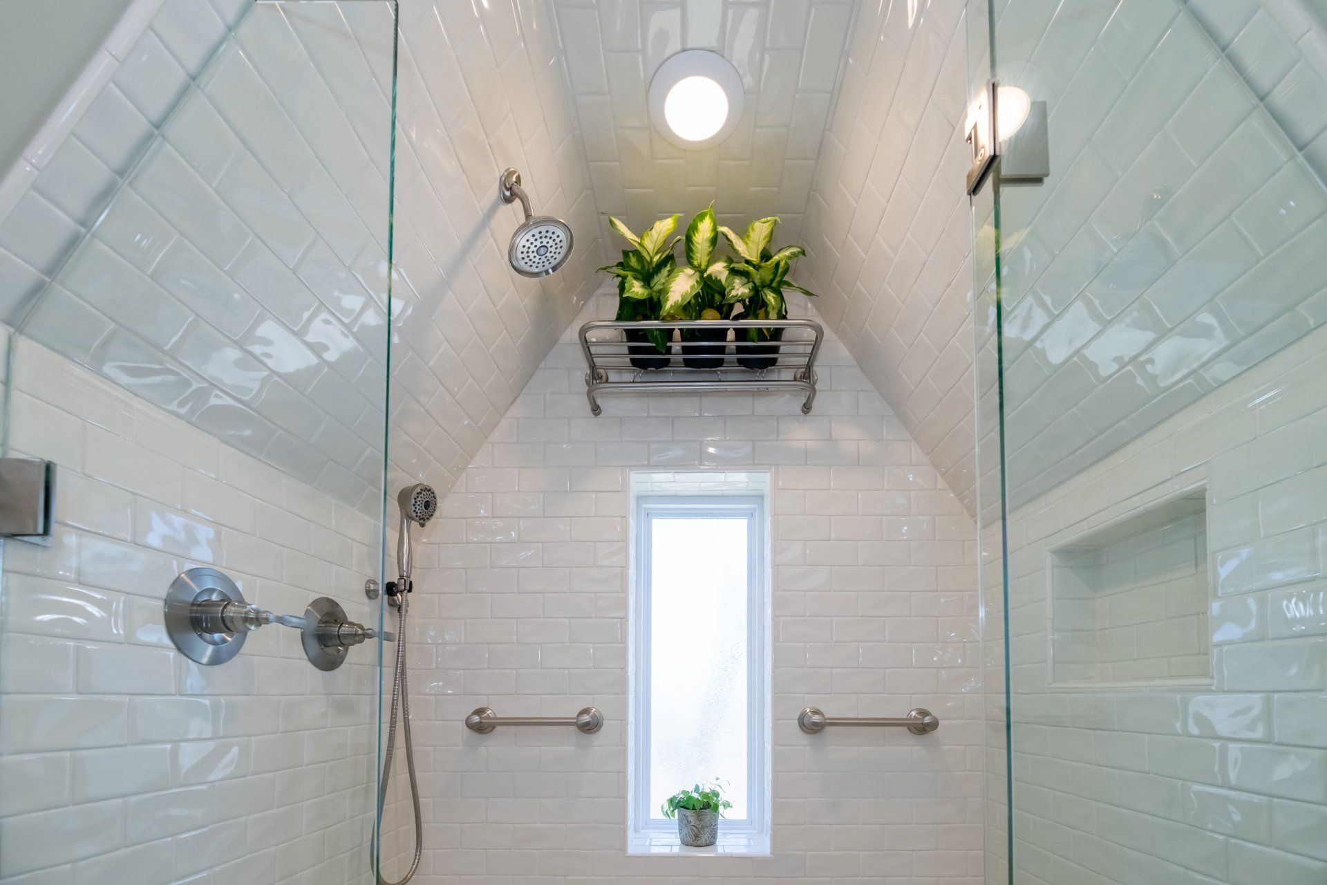 This cozy master bedroom is tucked away in the upper level of the home. Climbing a flight of stairs to use the bathroom was becoming tiresome. Using a dormer area, a full master bathroom was installed, complete with an onyx shower base and tile walls. The custom shower enclosure fits tight to the sloped dormer walls with the center door being able to swing in or out of the shower.