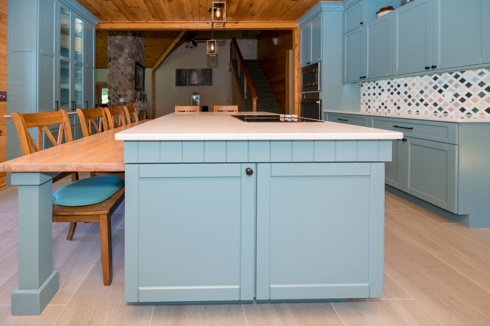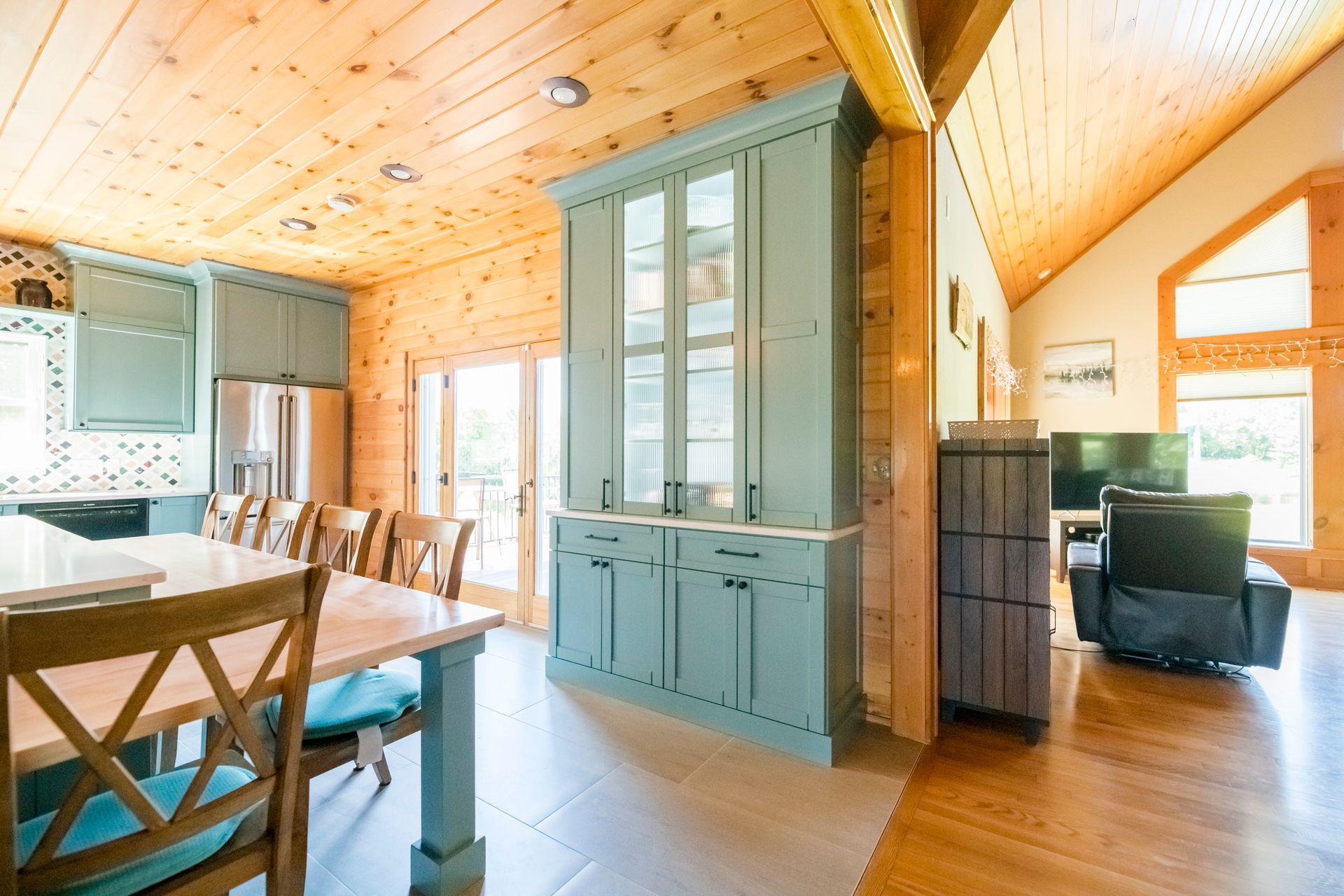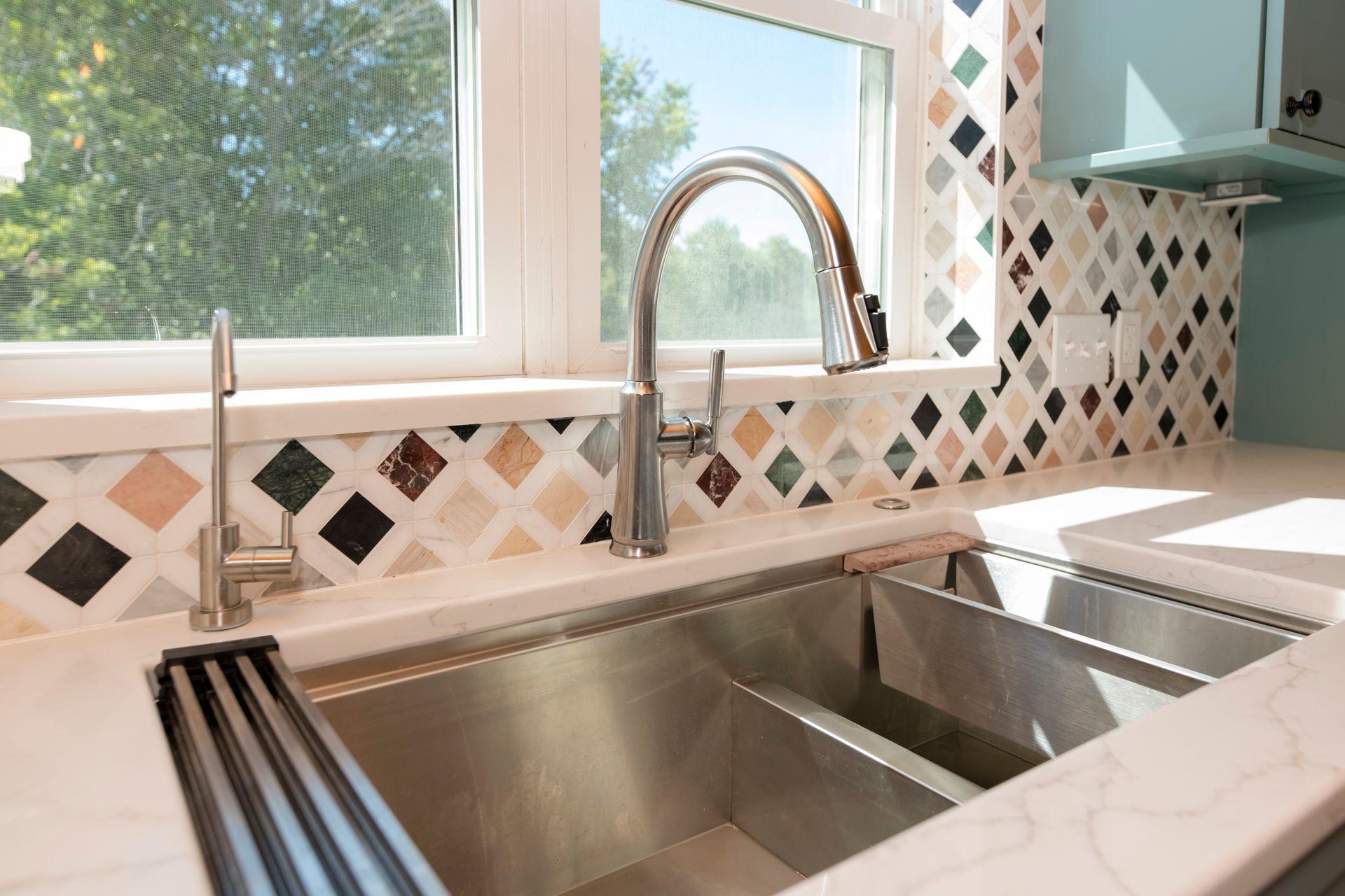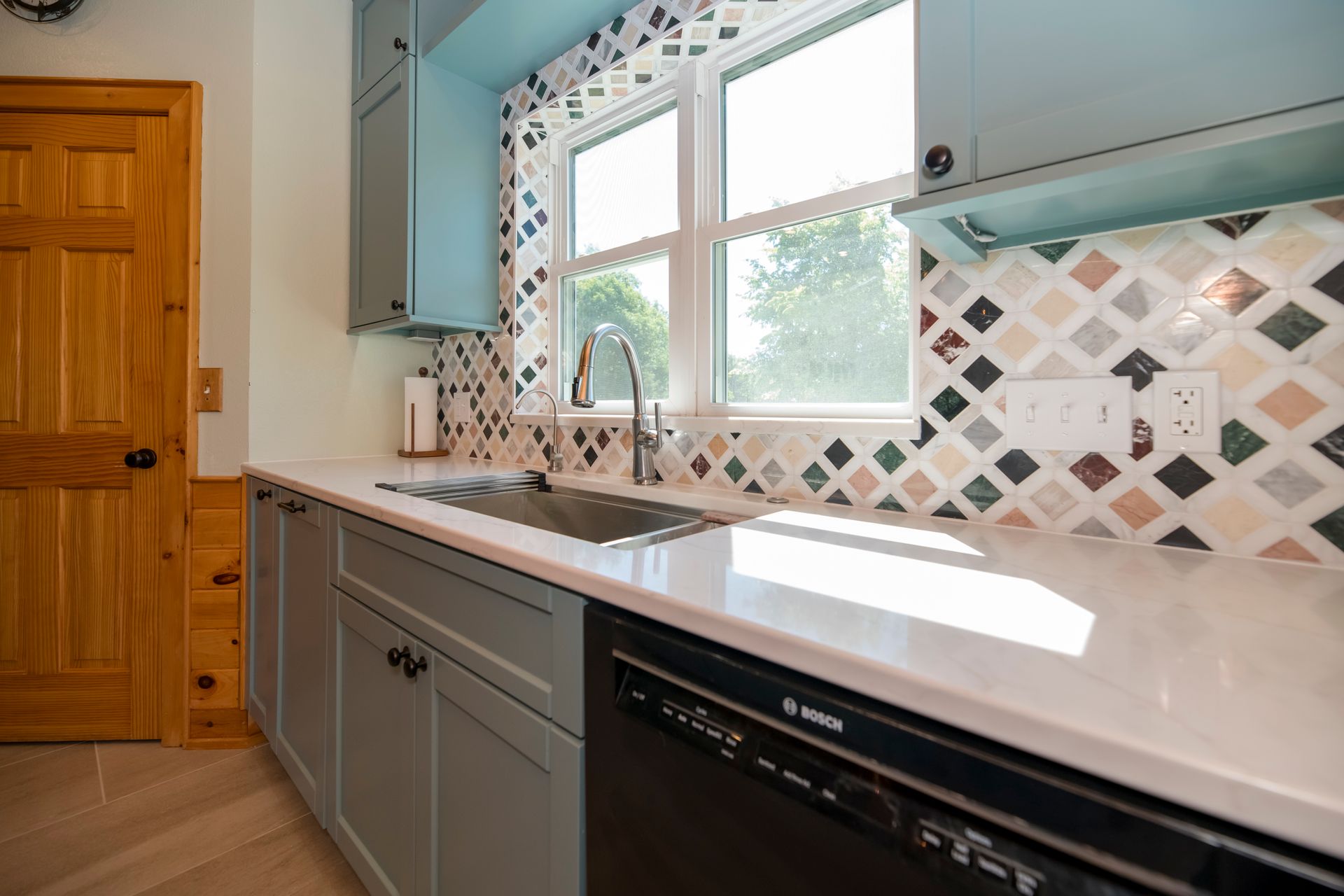 The kitchen had dark tile, deep red walls and outdated cabinets. The KBRD team replaced with a lighter green cabinet, lighter tile, light grey walls, and a vibrant backsplash – all of this seemed to really liven up the kitchen. New pendant lighting and appliances, including an induction stove top w/ downdraft vent to keep things nice and open.