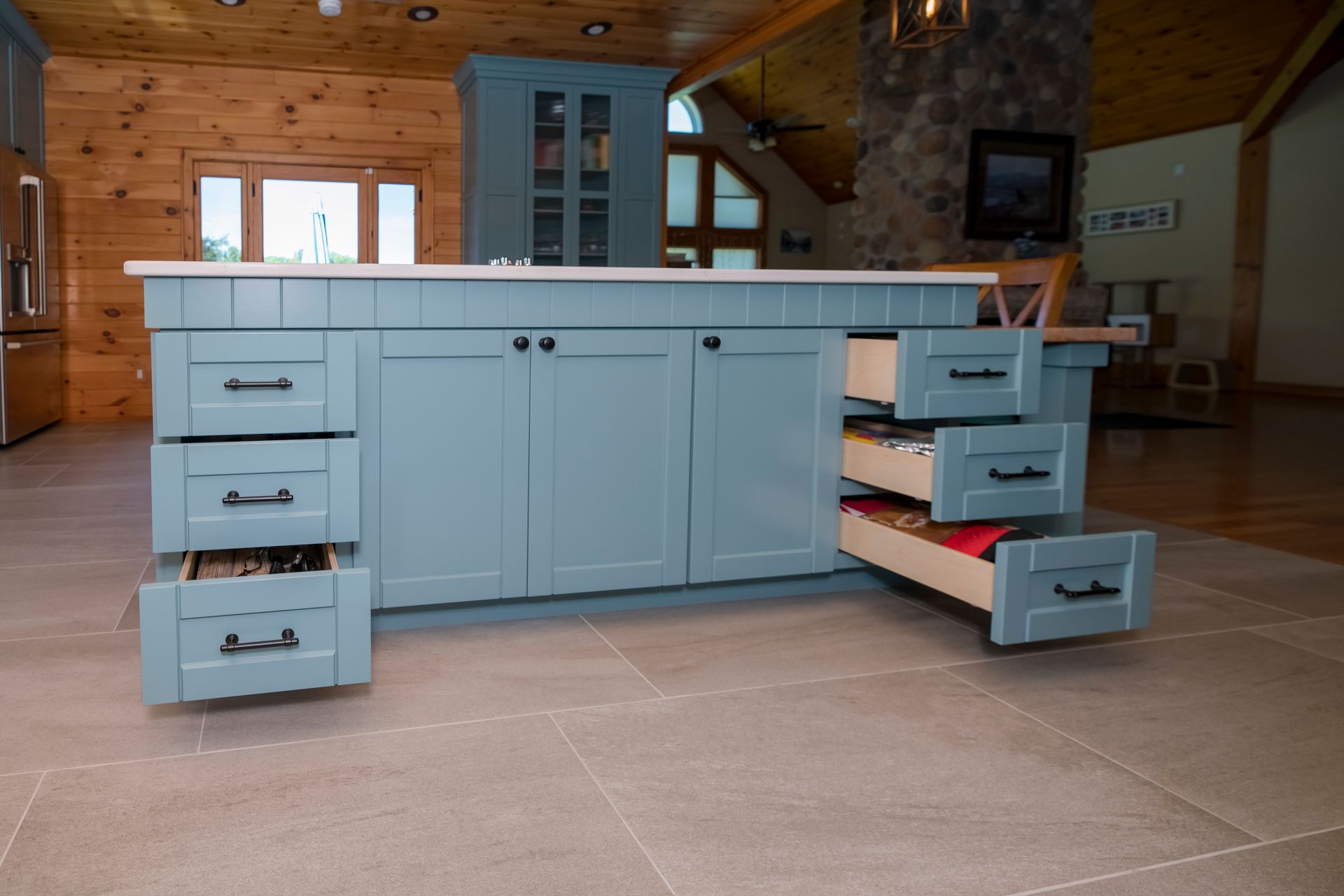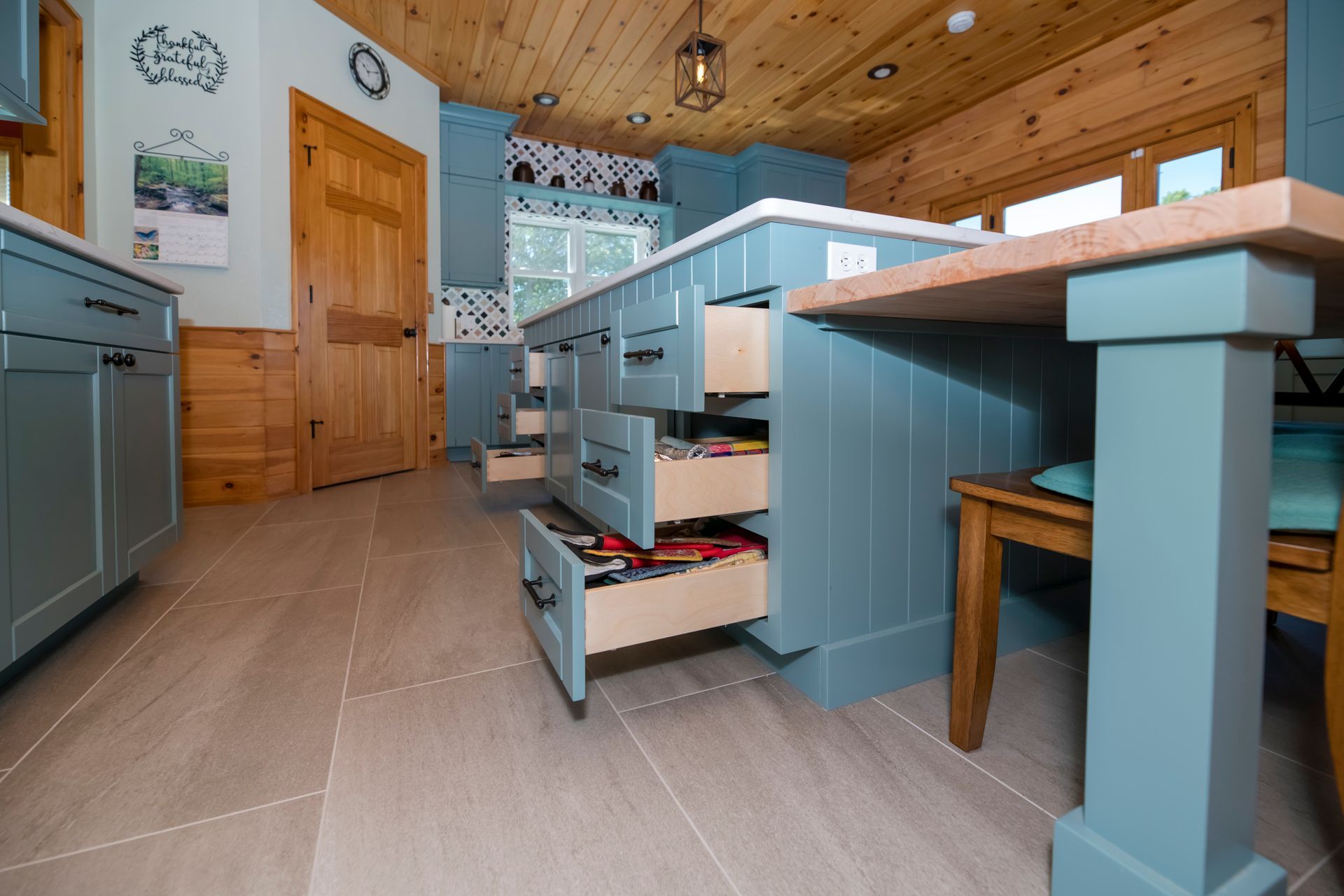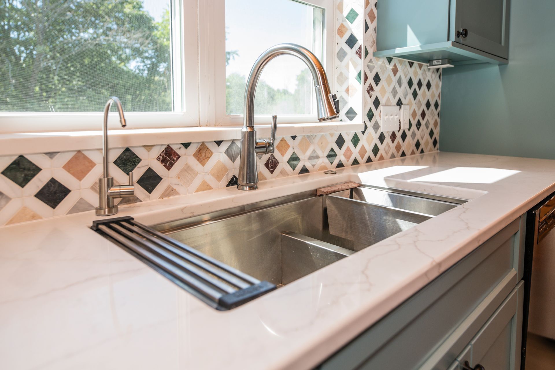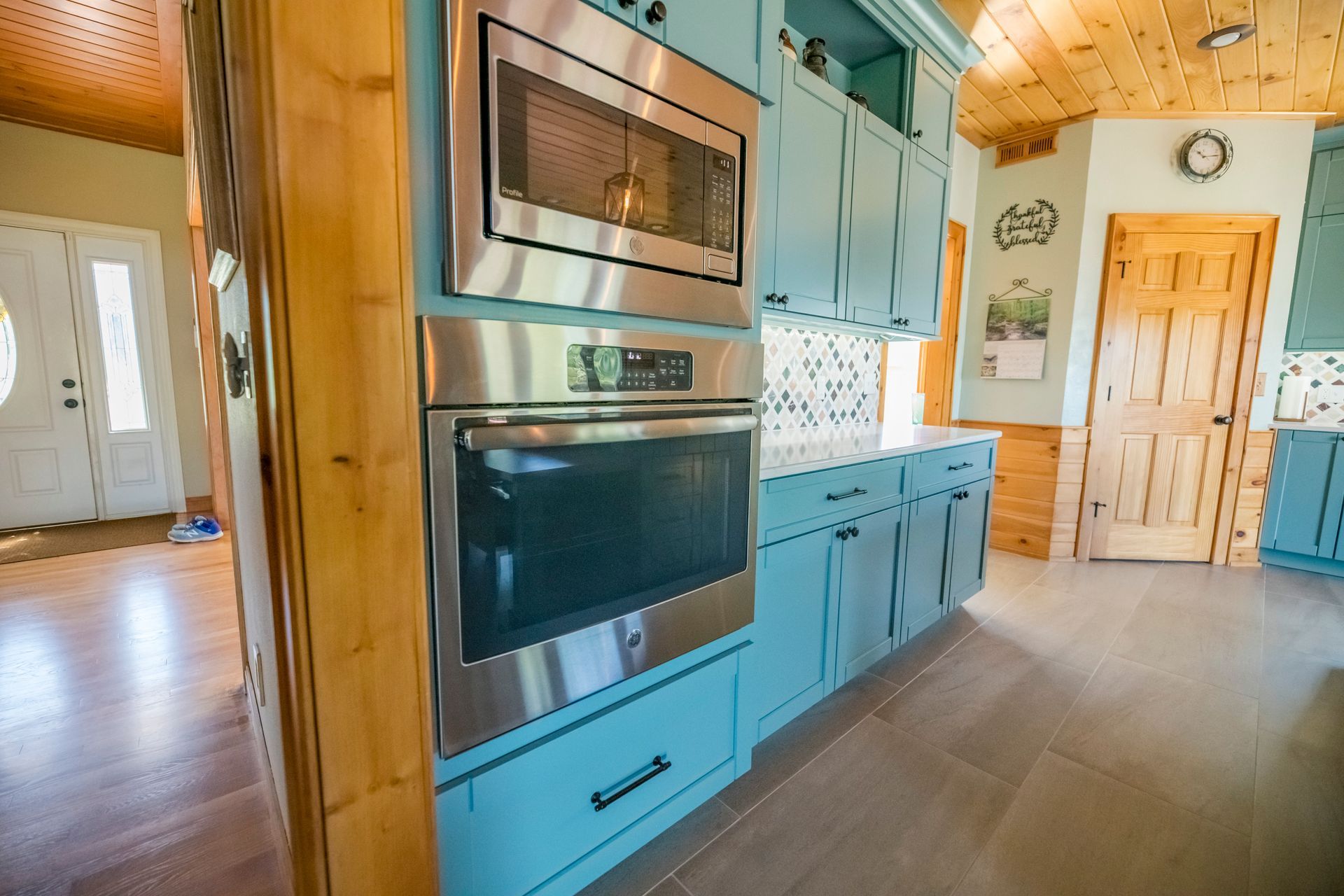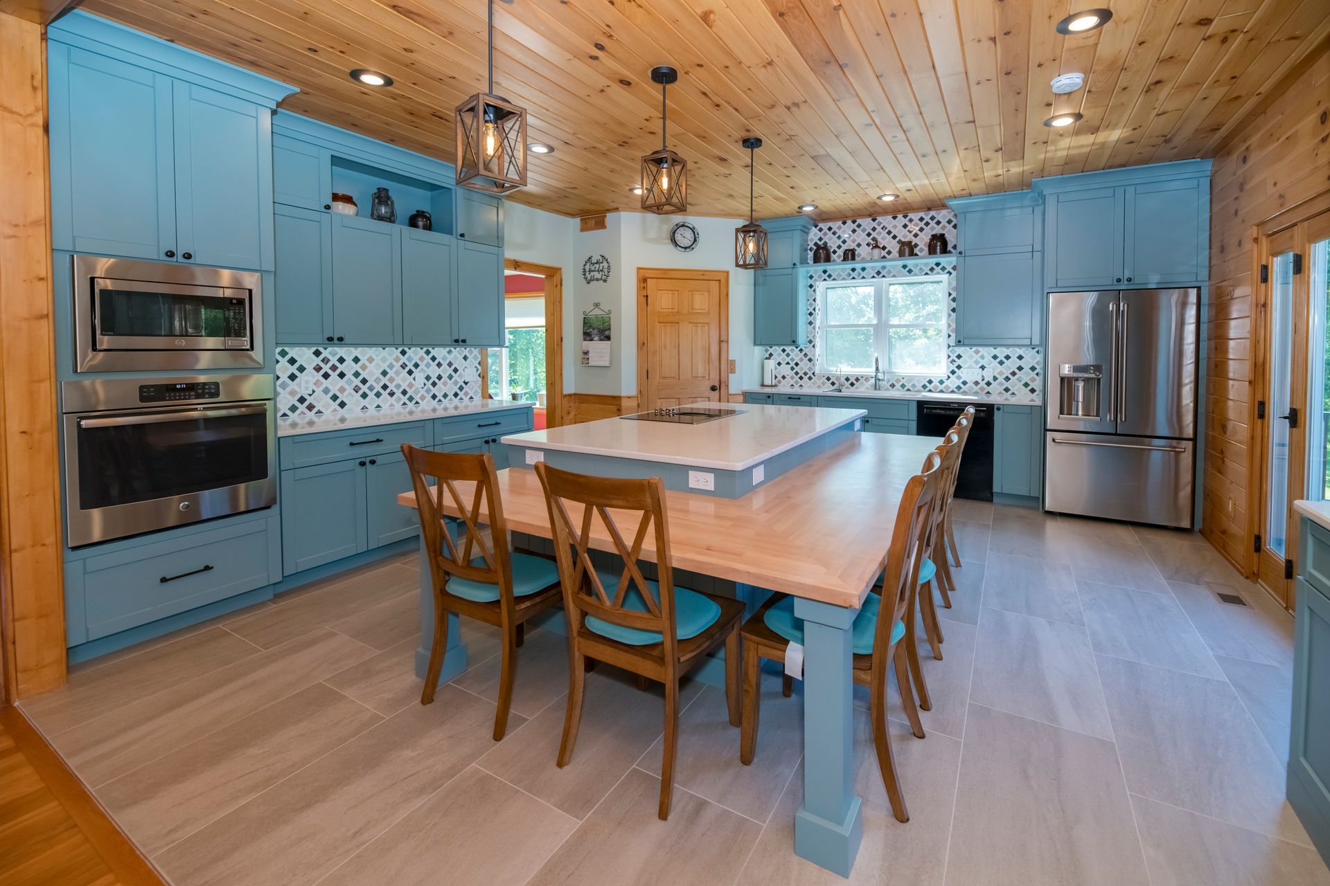 The kitchen had dark tile, deep red walls and outdated cabinets. The KBRD team replaced with a lighter green cabinet, lighter tile, light grey walls, and a vibrant backsplash – all of this seemed to really liven up the kitchen. New pendant lighting and appliances, including an induction stove top w/ downdraft vent to keep things nice and open.