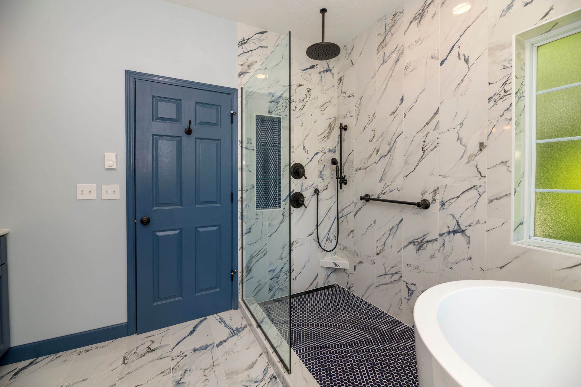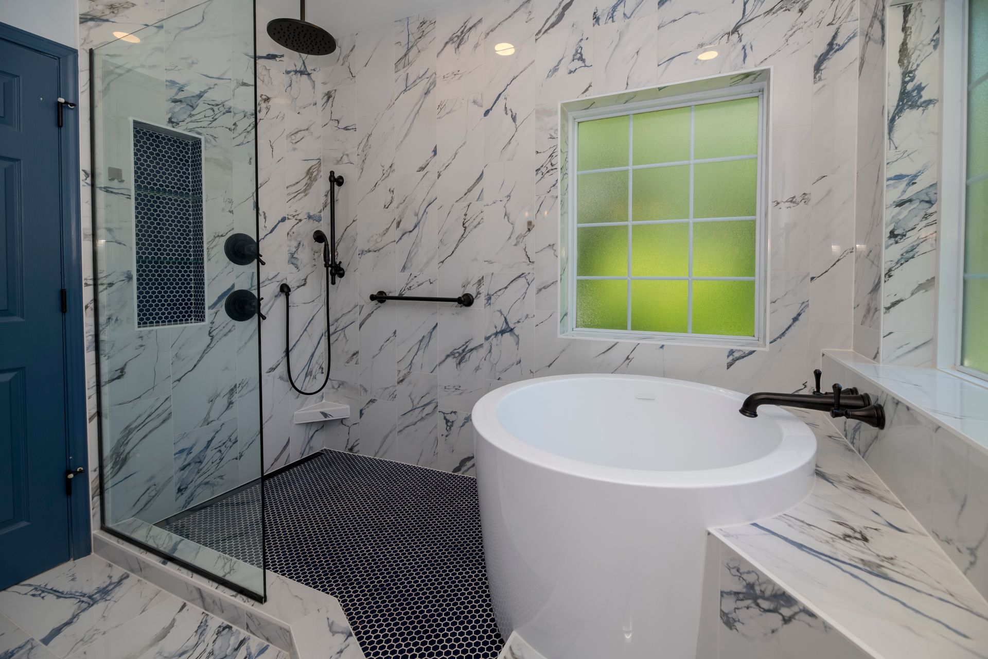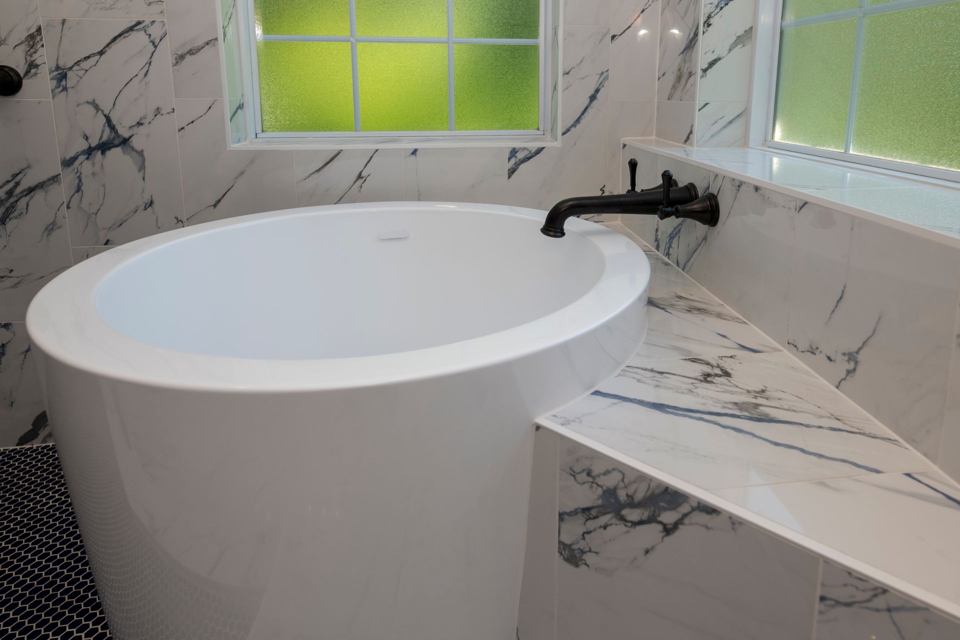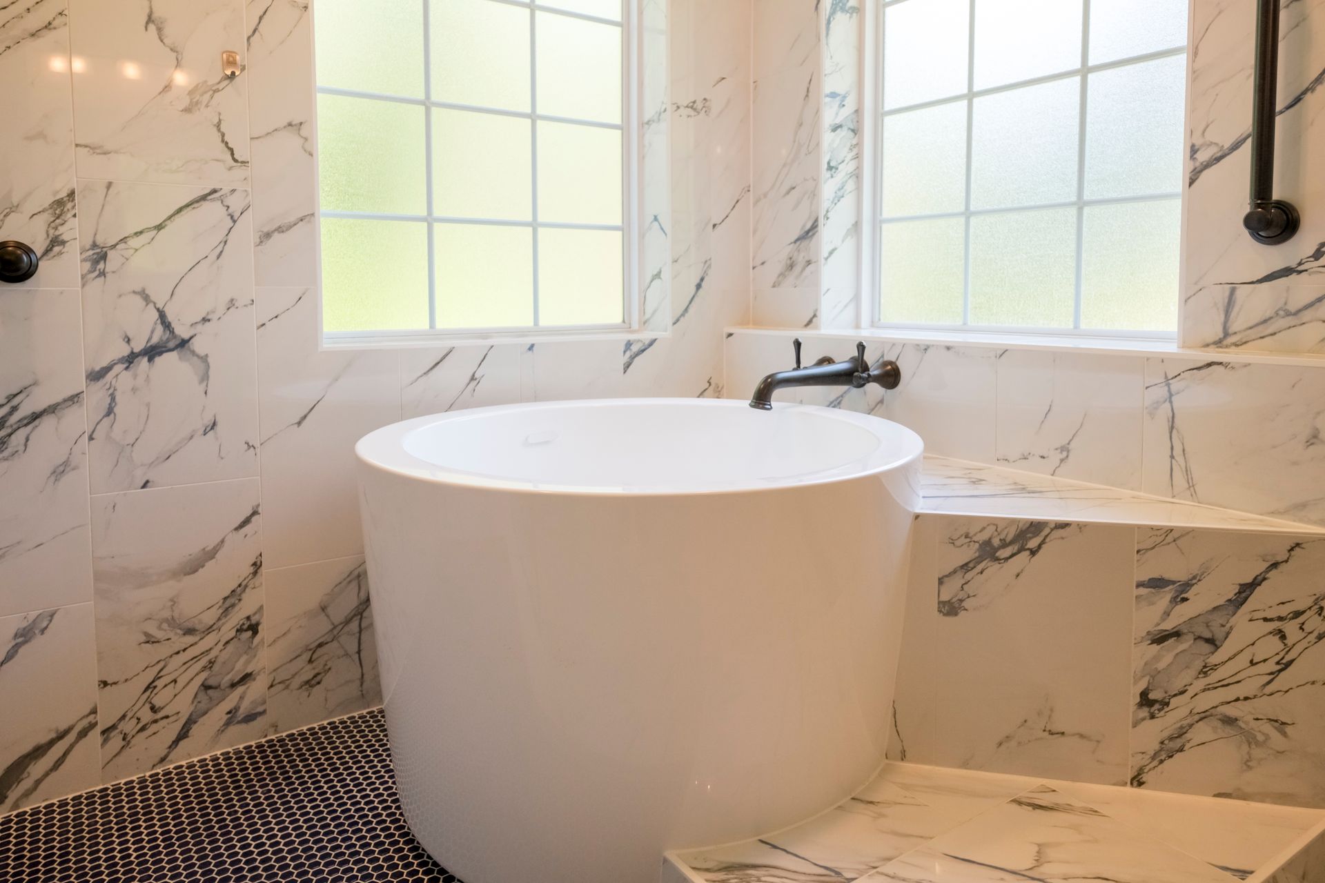 The Marshall master bath was a large room, but was overtaken by the corner jacuzzi tub. They were able to maximize space by removing the oversized jacuzzi tub and going back with a smaller Japanese Style Soaker tub and large walk-in tile shower. The white tile, light paint color and open concept shower really brightened up the room and made it feel bigger.