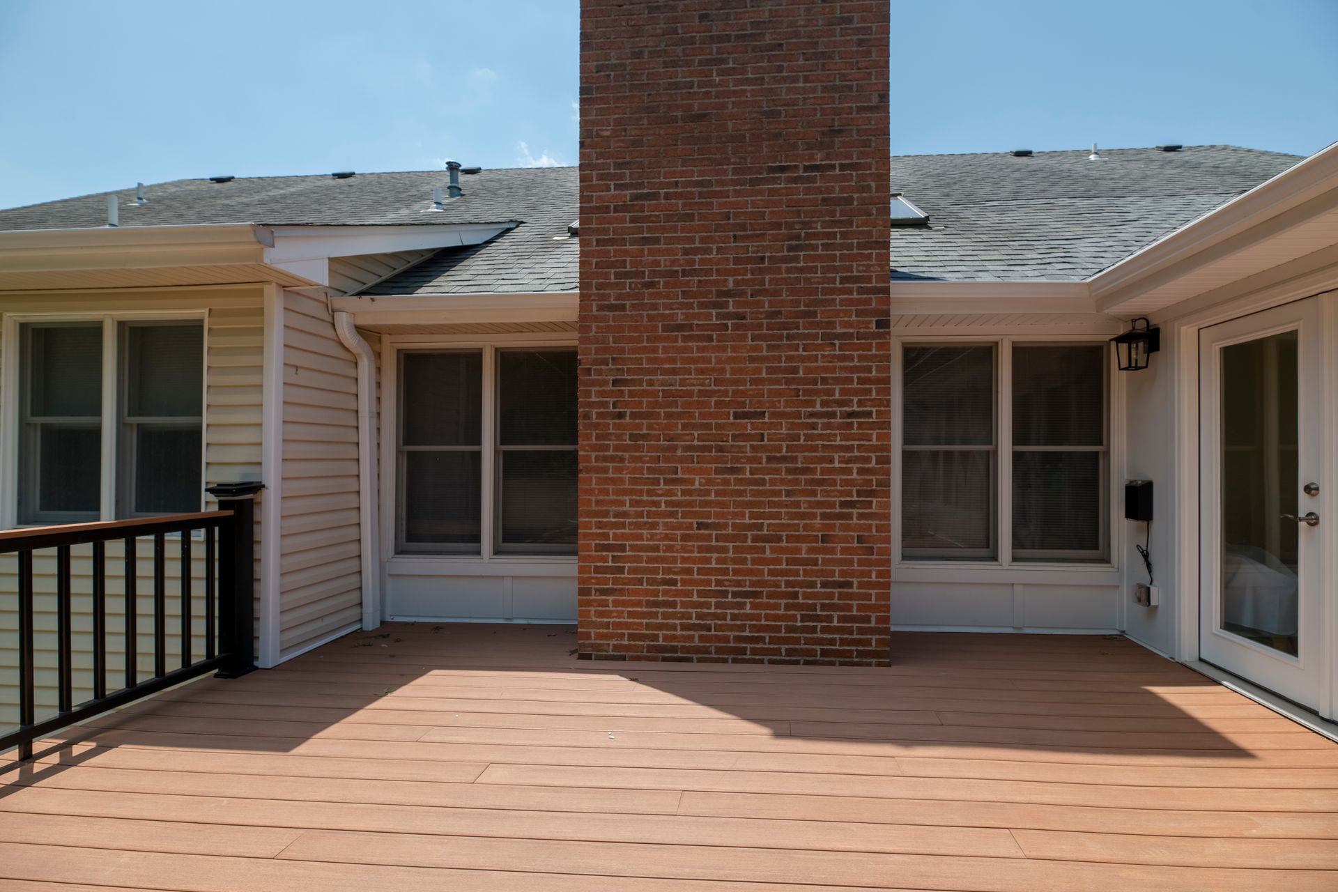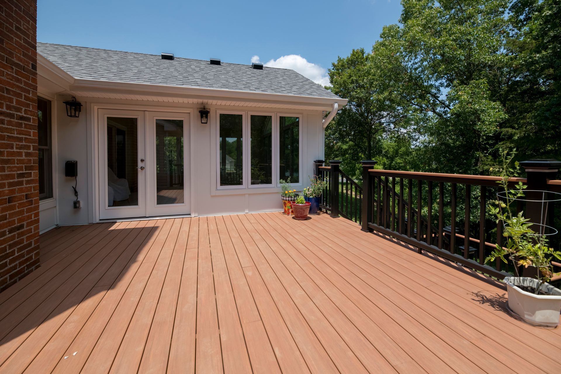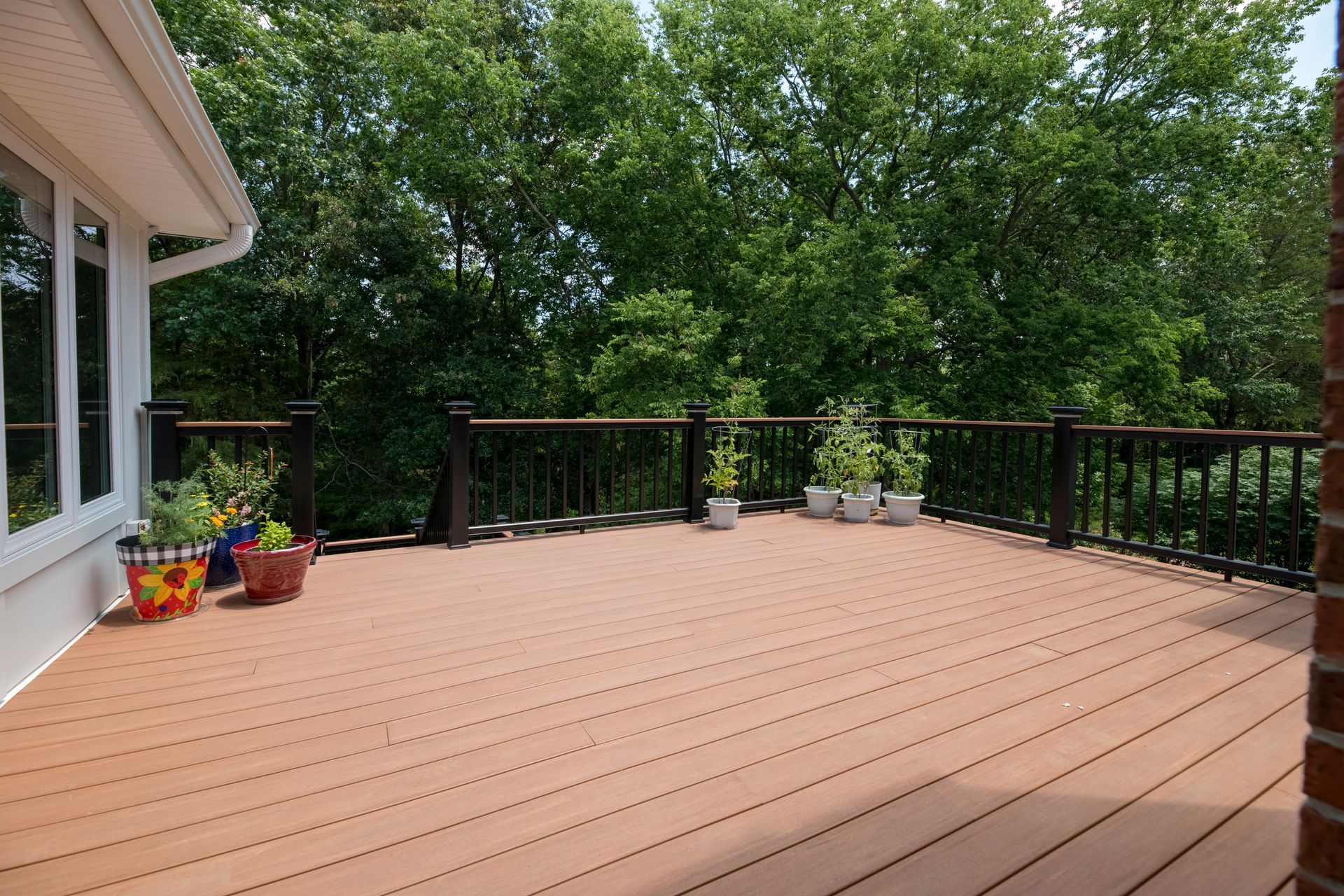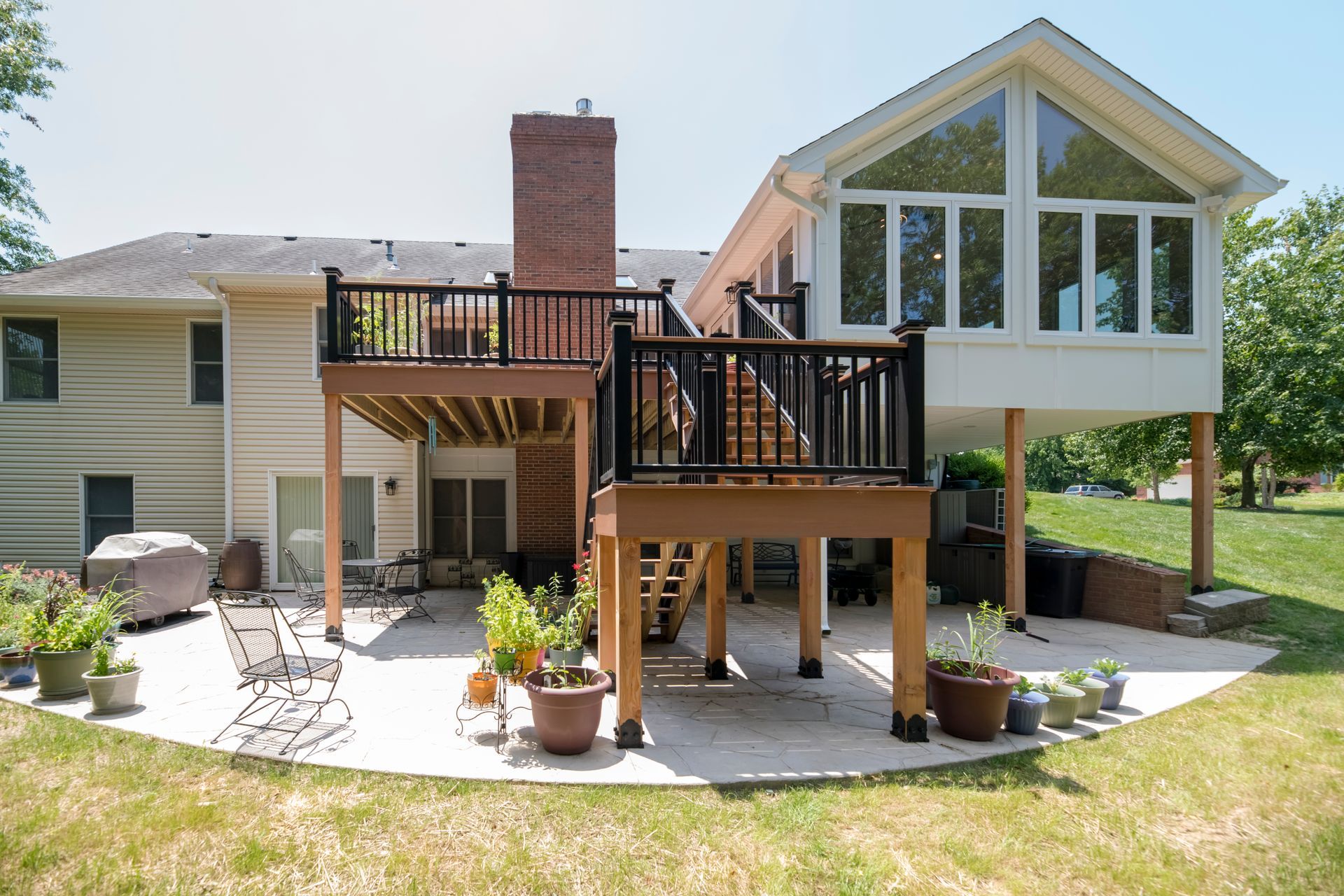 An old deck that was not in good shape and two small concrete patios that the customer was not using at all. Customer wanted a space where they could view and enjoy the private backyard/wooded lot. So we removed the old deck and two small patios. KBRD team created a large stamped concrete pad, while adding a 16x16 sunroom with windows all around. Additionally ,a larger deck was placed with composite decking for minimal maintenance. During install of the new gutters and downspouts, we made modifications to the downspouts to accommodate their rain barrels, for easy watering of plants