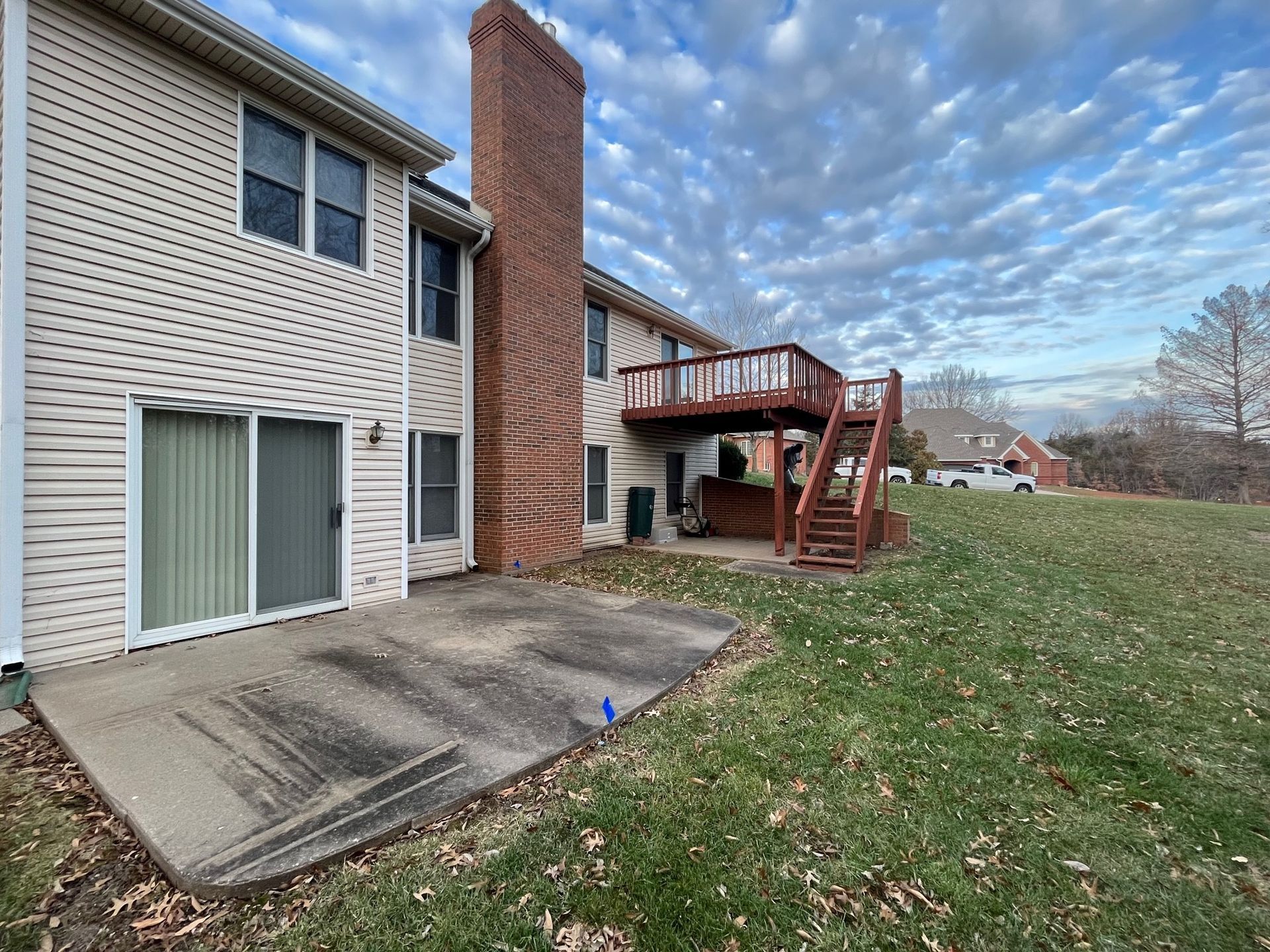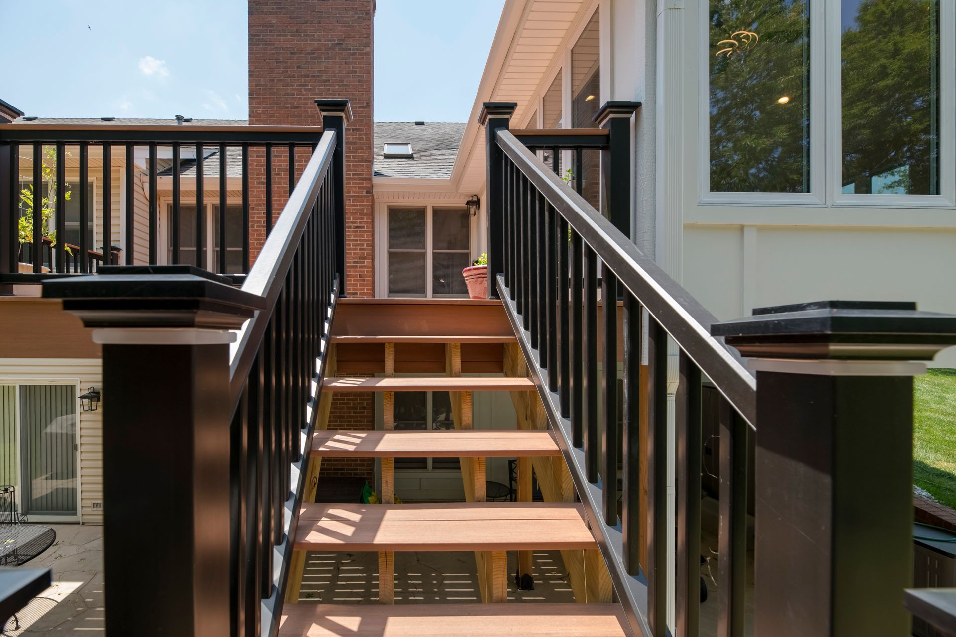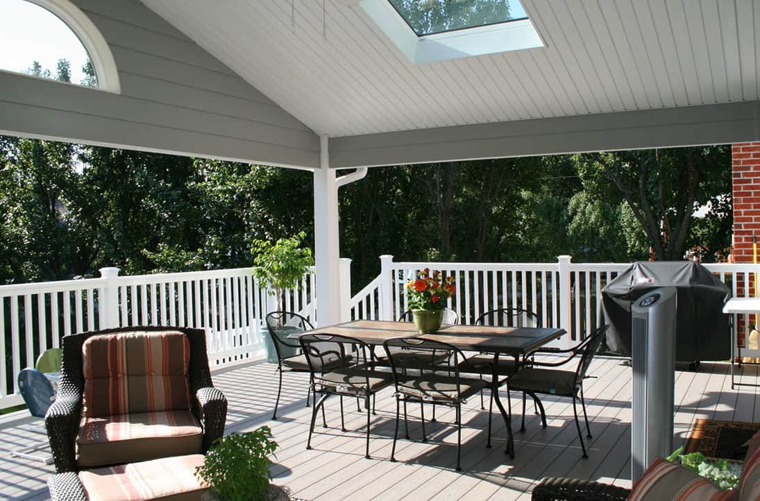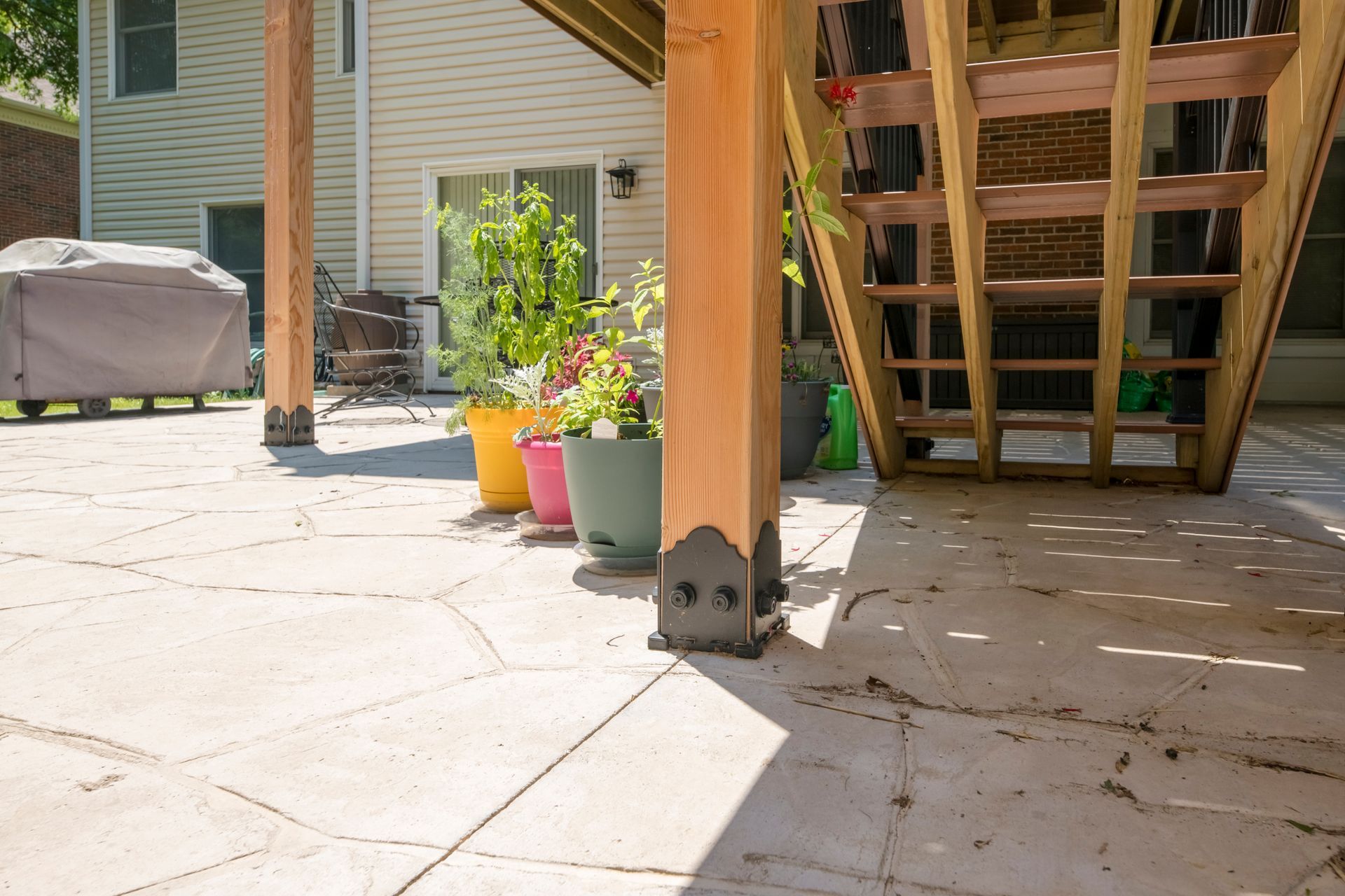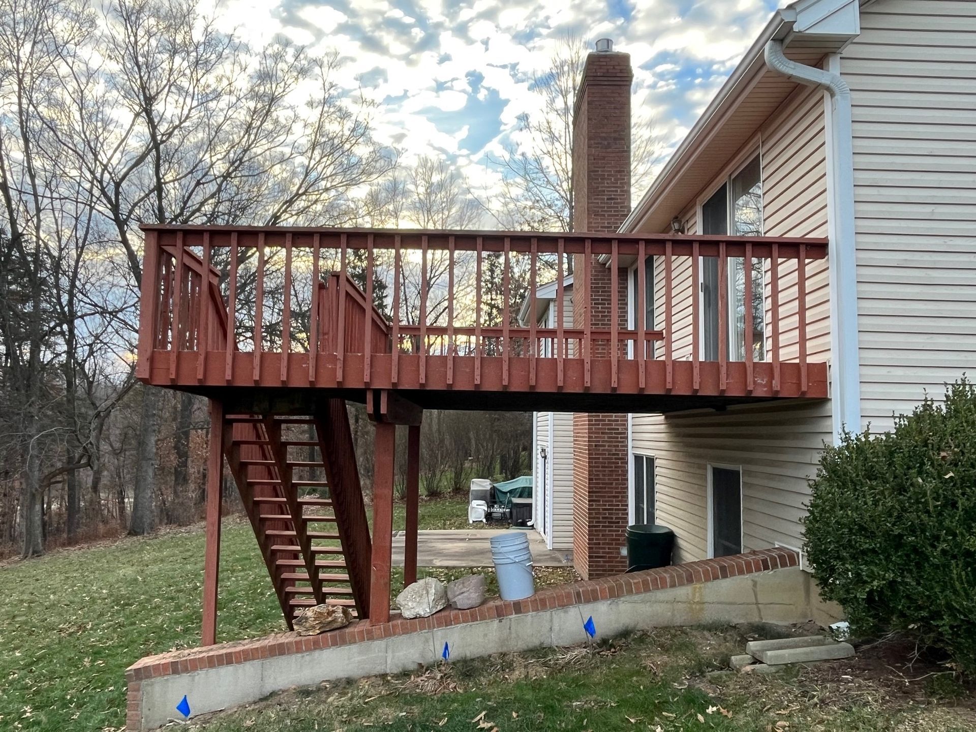 An old deck that was not in good shape and two small concrete patios that the customer was not using at all. Customer wanted a space where they could view and enjoy the private backyard/wooded lot. So we removed the old deck and two small patios. KBRD team created a large stamped concrete pad, while adding a 16x16 sunroom with windows all around. Additionally ,a larger deck was placed with composite decking for minimal maintenance. During install of the new gutters and downspouts, we made modifications to the downspouts to accommodate their rain barrels, for easy watering of plants