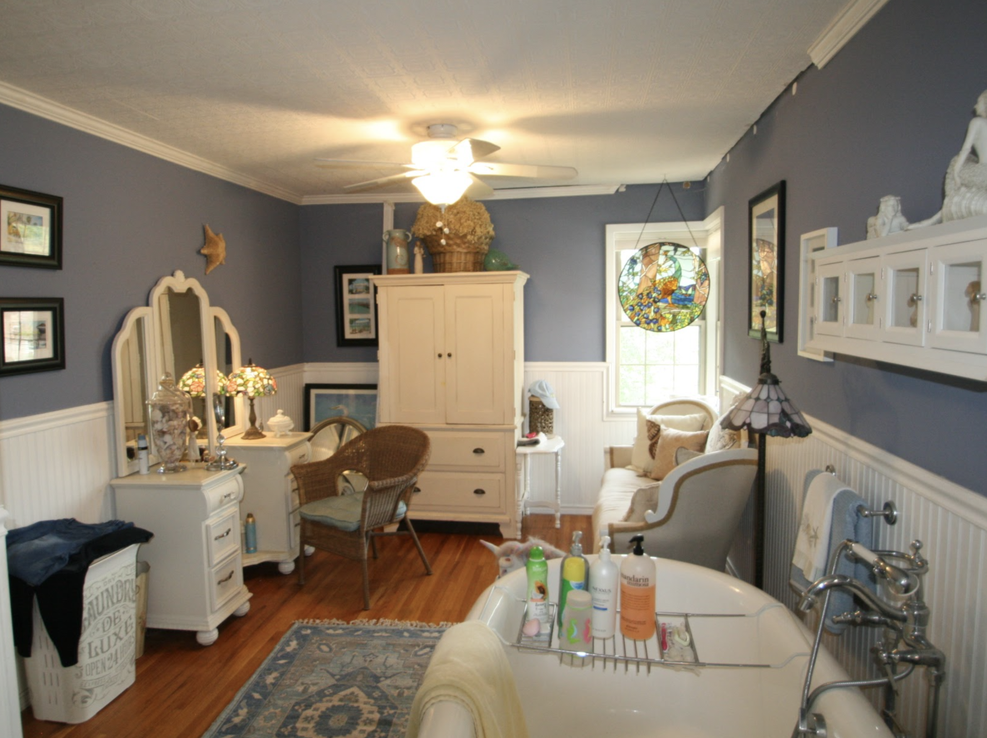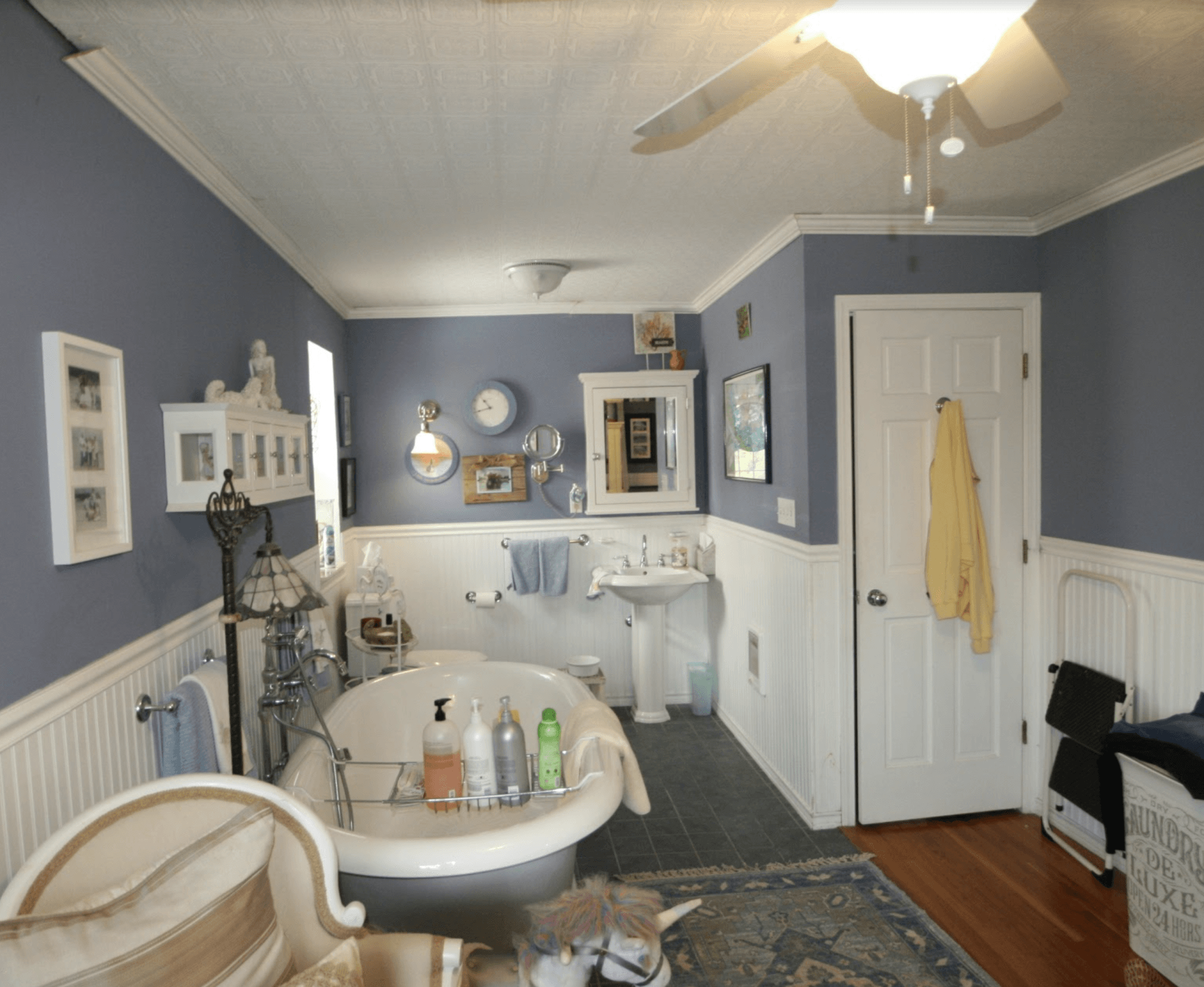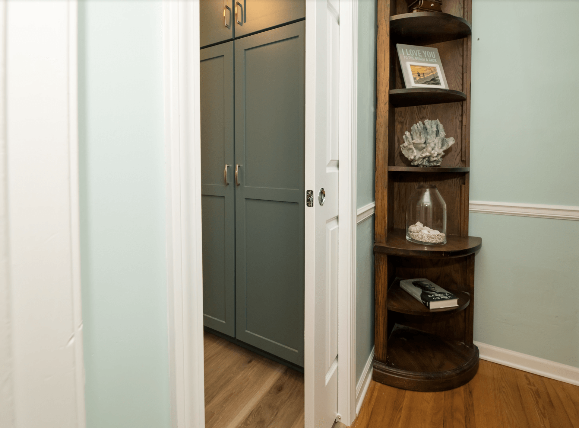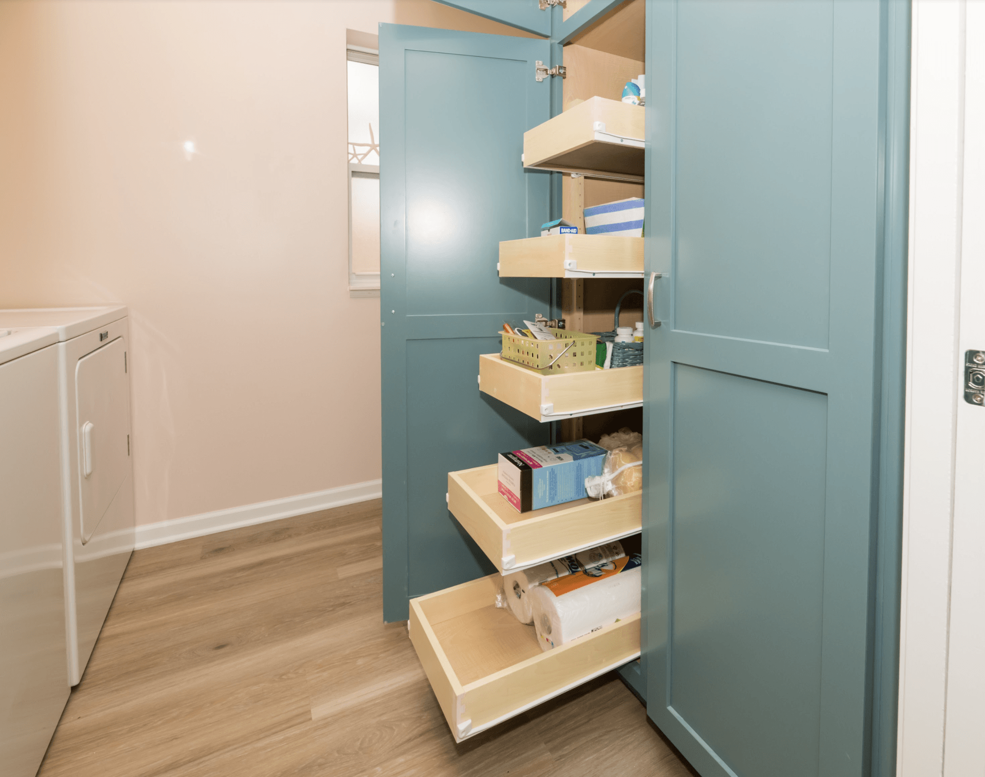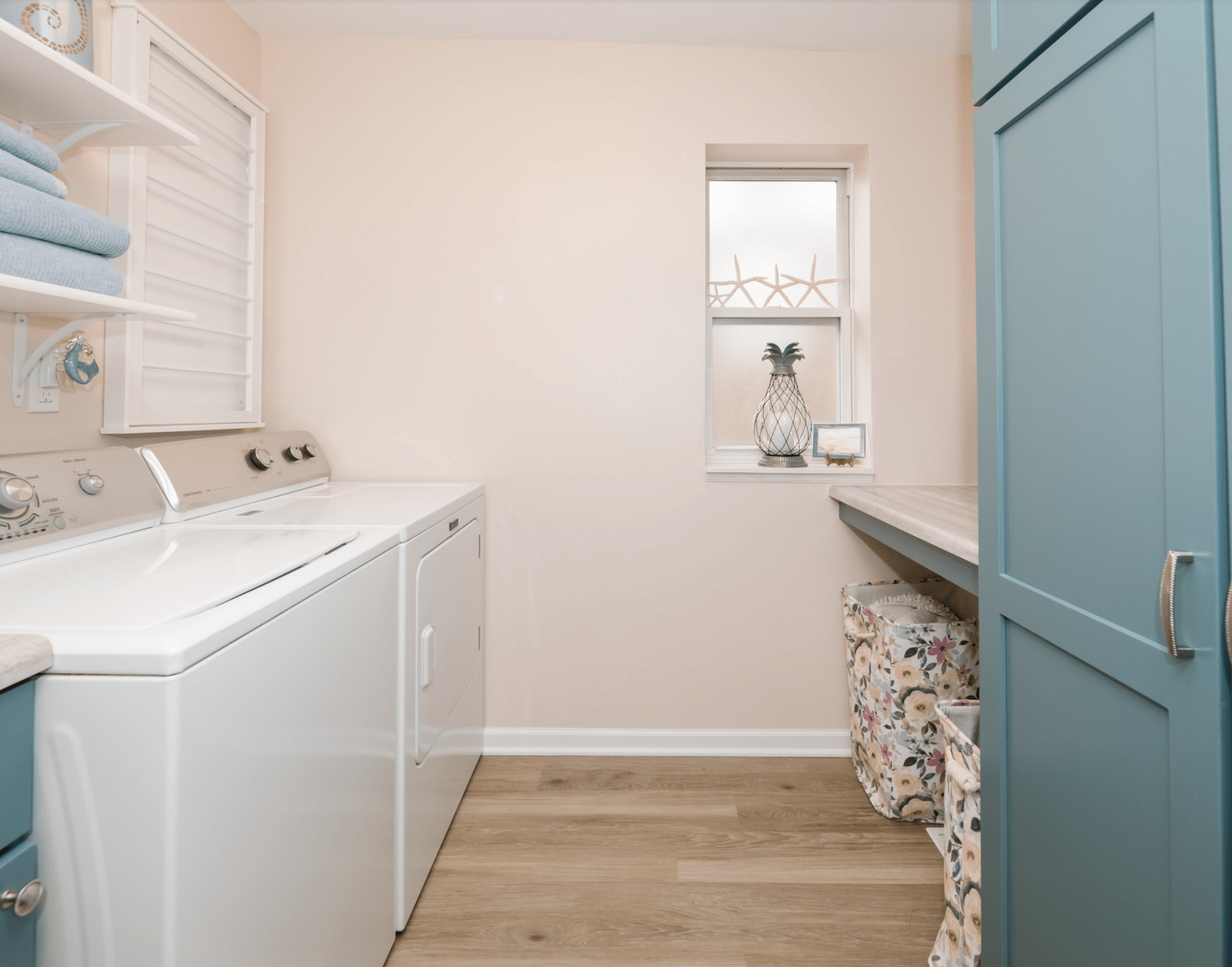Our homeowner was ready to eliminate her unused 6' pedestal tub and build a safe walk-in shower. She also needed to get her laundry room out of the basement and onto the main level. It was becoming arduous and dangerous climbing a flight of stairs to do her laundry. The new walkin shower is a custom onyx base and walls with a decorative tile border complete with 2 separate valve controls for each shower head. Luxury vinyl plank flooring is in the bathroom and laundry room.