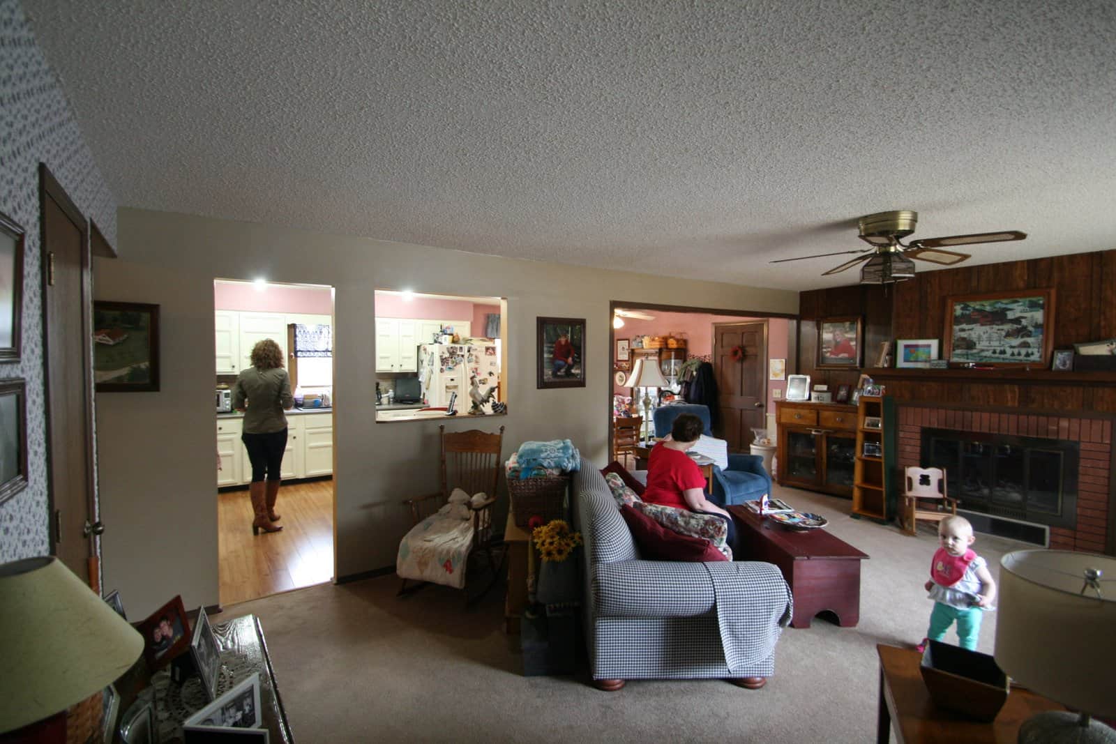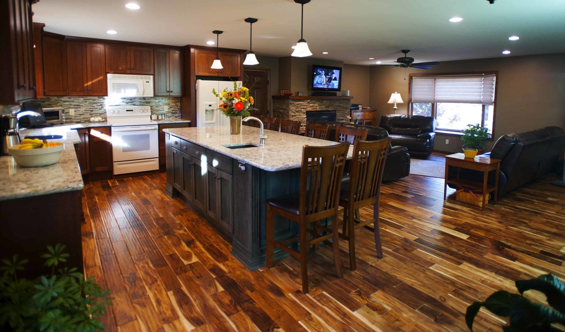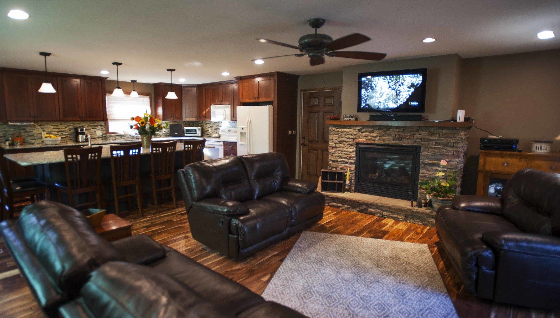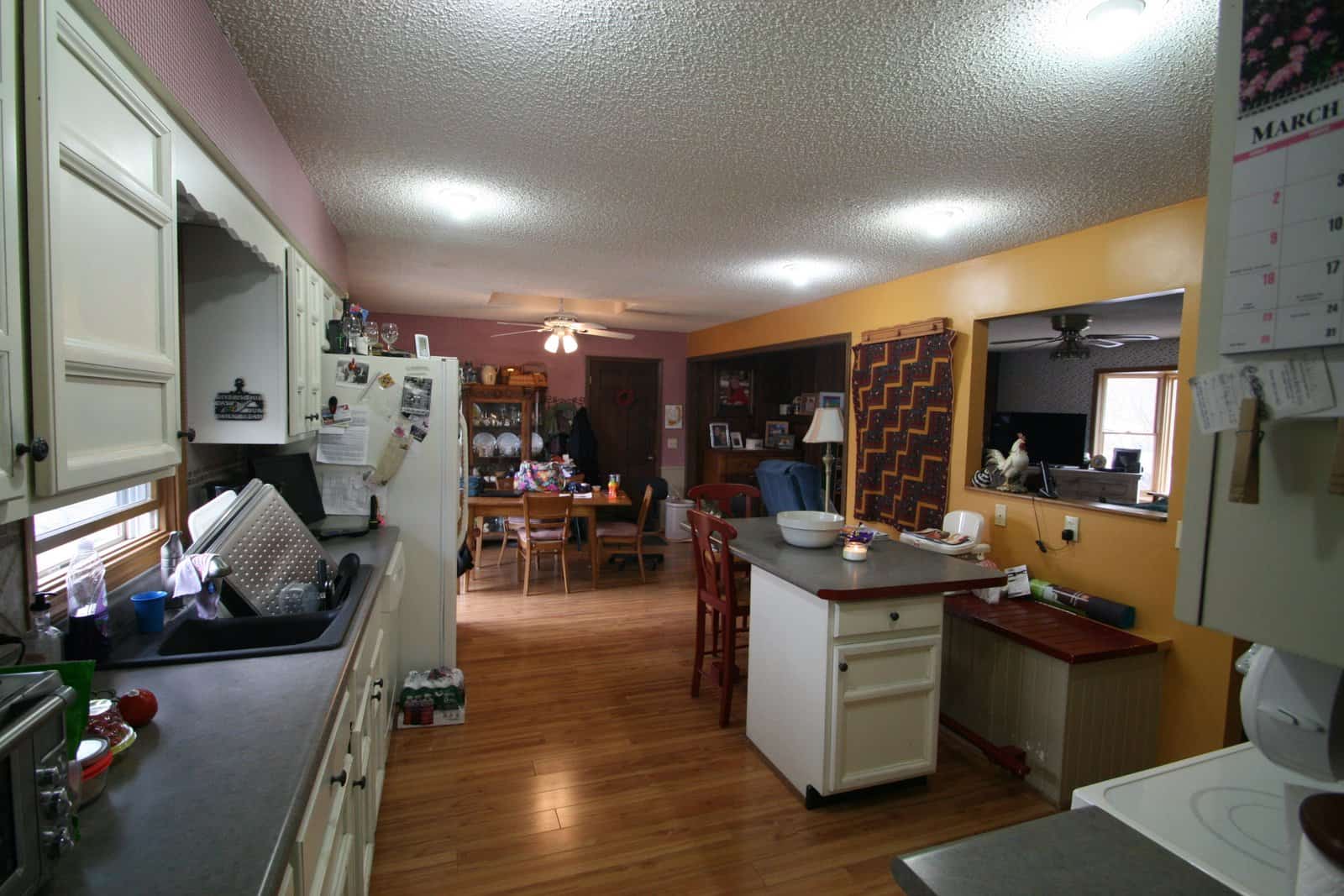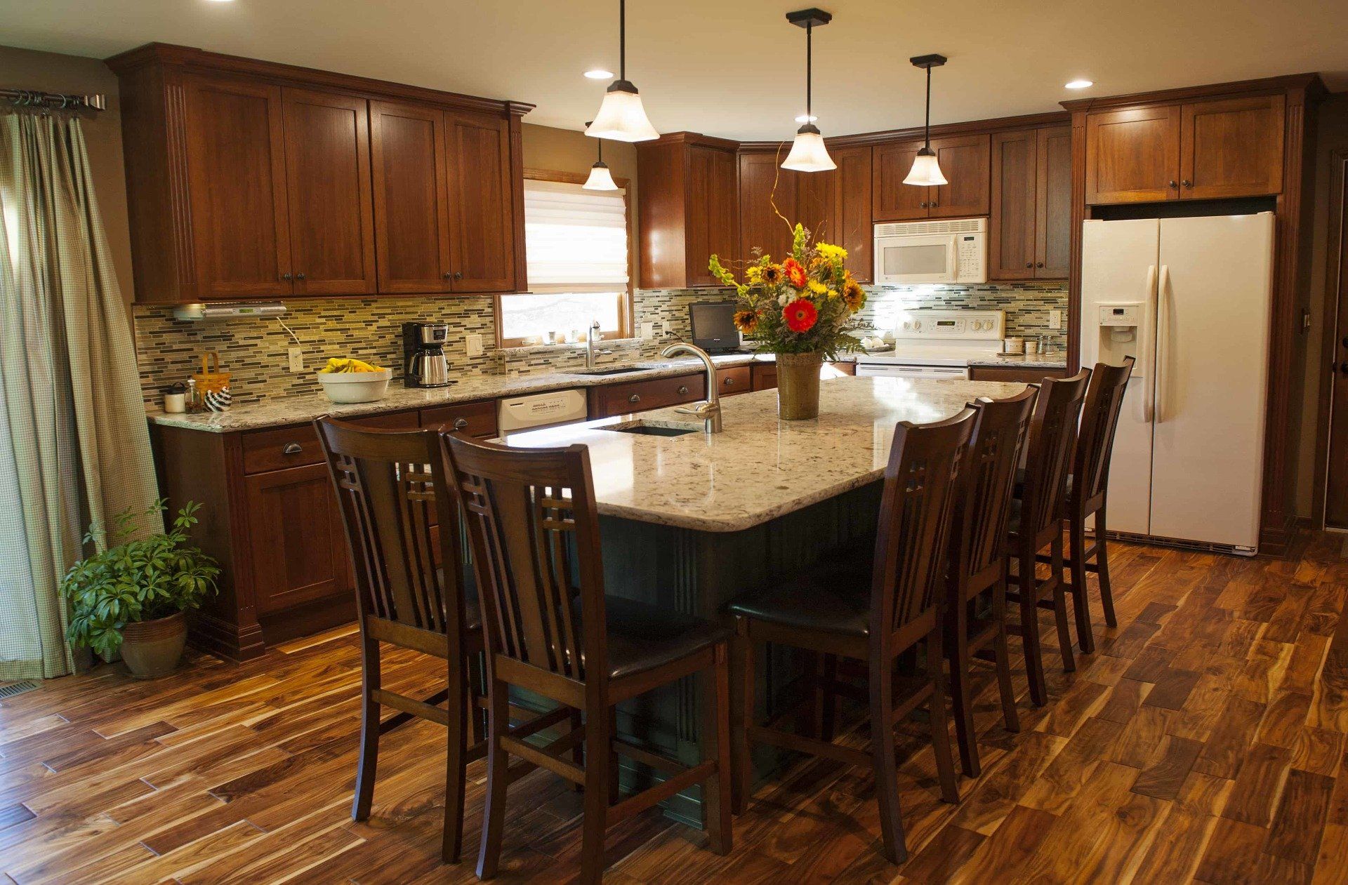 Entertaining with family became difficult with lack of counterspace and limited seating. With lots of cooking, it became important to have the counters taller and deeper with a good amount of floorspace for family to flow through. The paneling made the space dark and closed off. The newly remodeled space is open to the family room with a new stone fireplace surround, an island with plenty of seating, and a second prep station with the sink in the island.