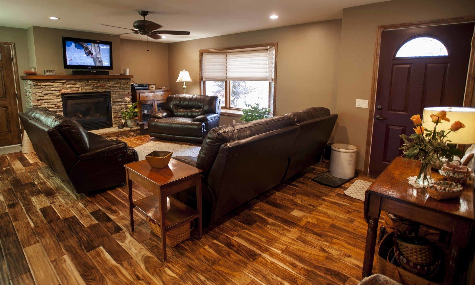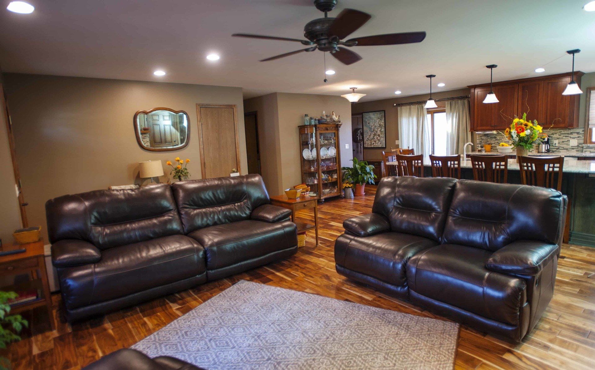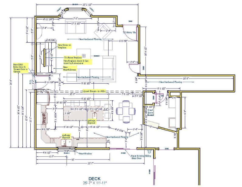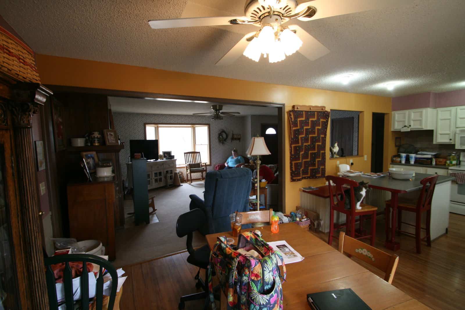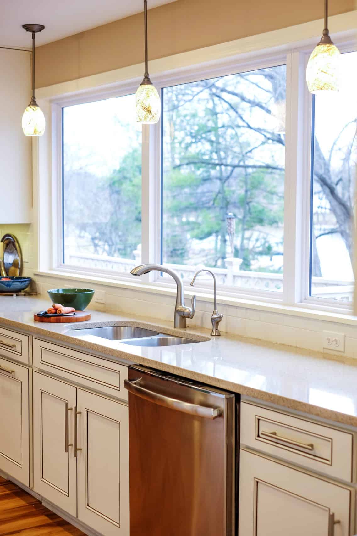 Entertaining with family became difficult with lack of counterspace and limited seating. With lots of cooking, it became important to have the counters taller and deeper with a good amount of floorspace for family to flow through. The paneling made the space dark and closed off. The newly remodeled space is open to the family room with a new stone fireplace surround, an island with plenty of seating, and a second prep station with the sink in the island.