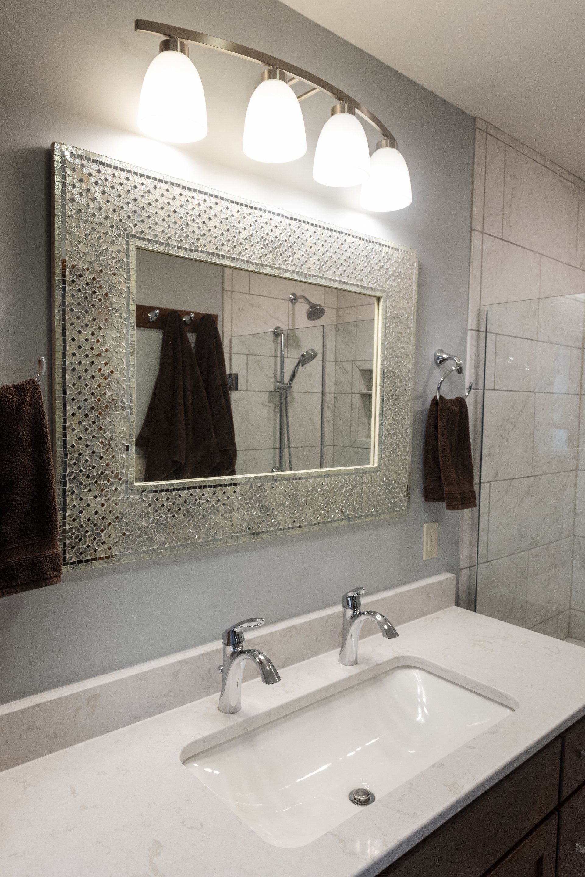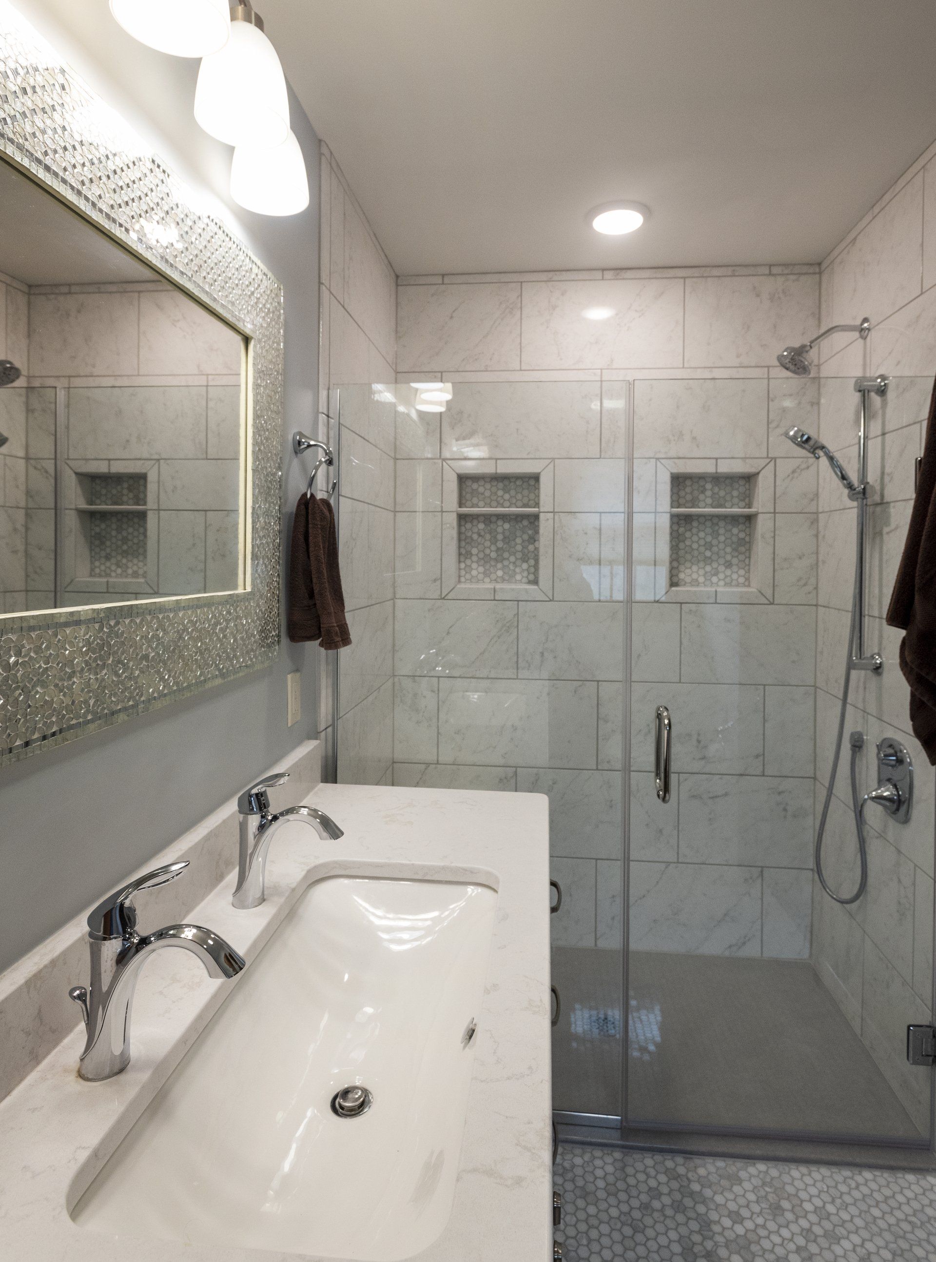 The master bath is complete with a custom walk-in tile shower. Using space from a nearby closet, allowed for the shower.