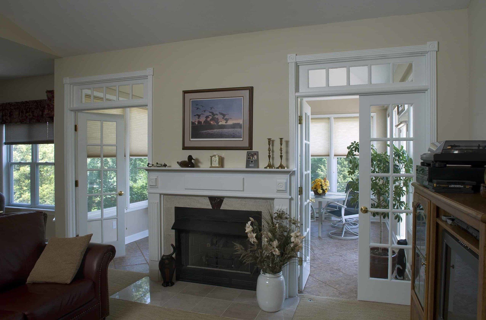 Converted a screened porch into a finished sunroom with double french doors and transom windows from the family room. This new sunroom has an inviting connection to the existing home.