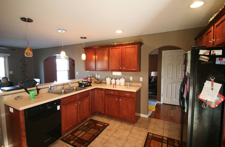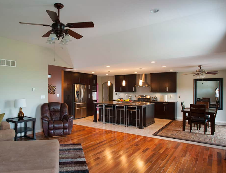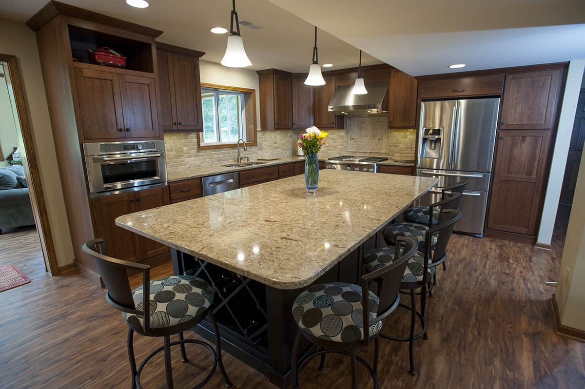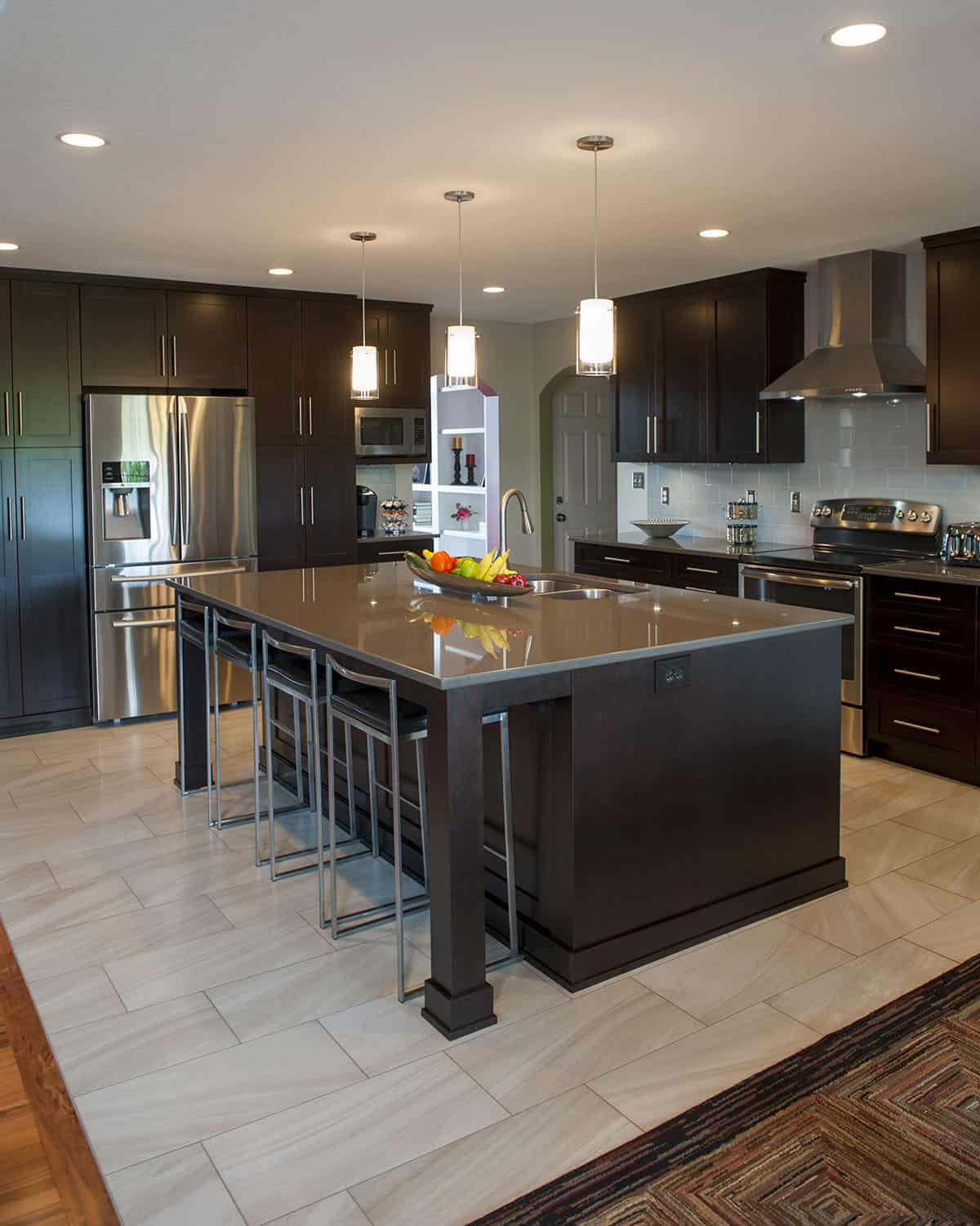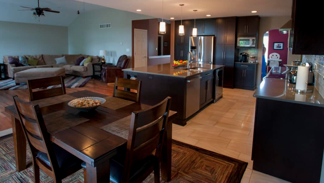 The Yankees in Smithton Estates are a young family with busy lives. Jim and Jessie Yankee looked to Kerry Bramon Remodeling and Design to transform their kitchen to keep pace. Designer Angela Holloway’s plan removed a wall so that the kitchen and living room could be combined into one large, open family space. This major change meant Jessie no longer had to feel isolated from the family when preparing meals in the kitchen. KBRD matched tiger wood flooring and added a tile floor to the sleek, clean-lined kitchen for durable, easy cleanup. An oversized island in the middle of the space, lit by modern pendant lighting, makes a perfect hub for the family. Custom birch cabinetry with a rich espresso stain and quartz countertops complete the dramatic, modern look.